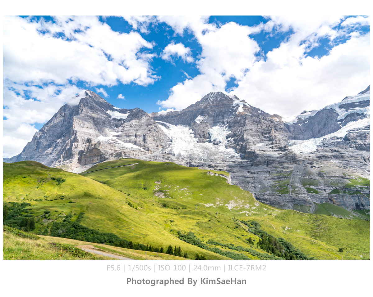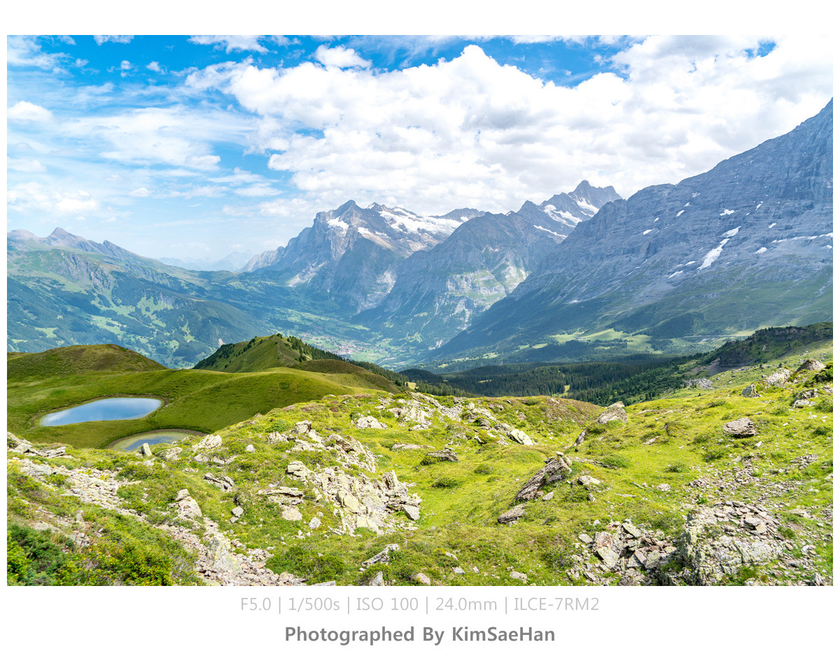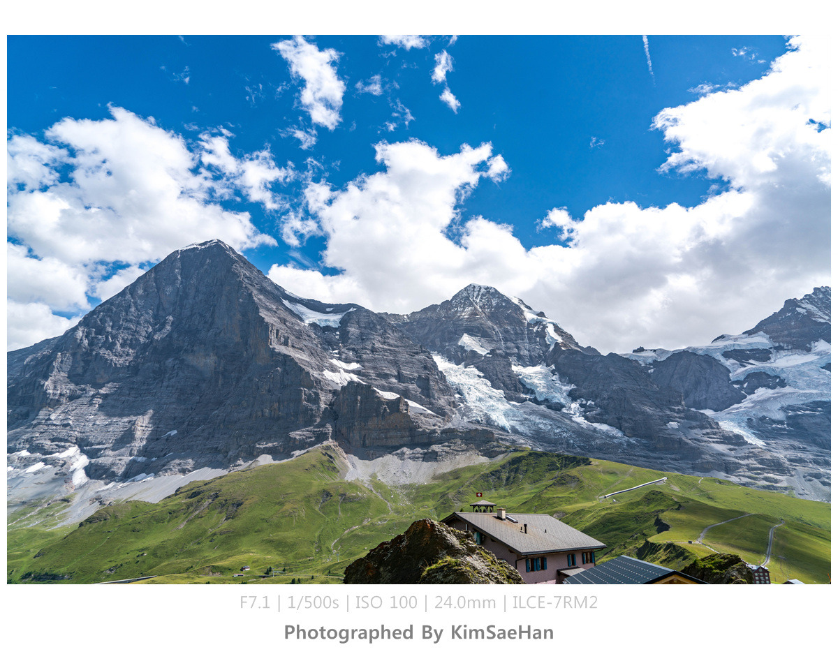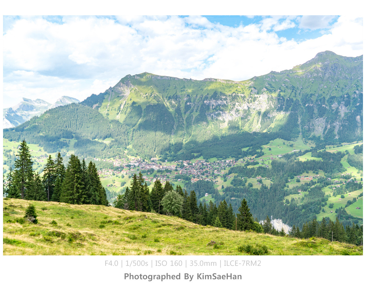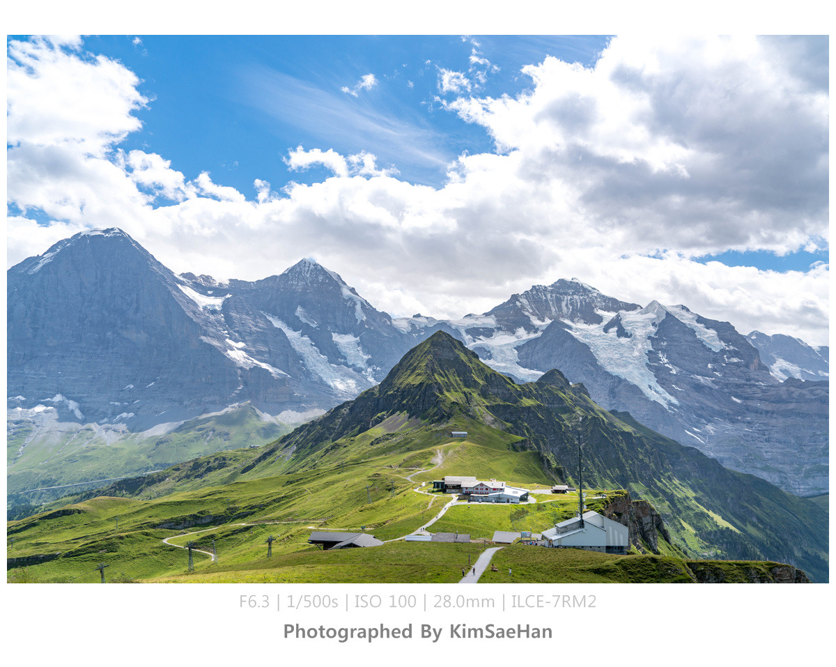그림 같은 길을 따라 천천히 걸어서 뻥 뚫린 풍경을 바라보며 걷다 보면, 어느새 꼭대기에 도착하게 된다. 고개를 왼쪽으로 돌리면 그린델발트가 보이고, 오른쪽으로 돌리면 벵엔이 보인다. 또 눈 앞에 3개의 봉우리가 보인다. 특히, 융프라우는 장관이다.