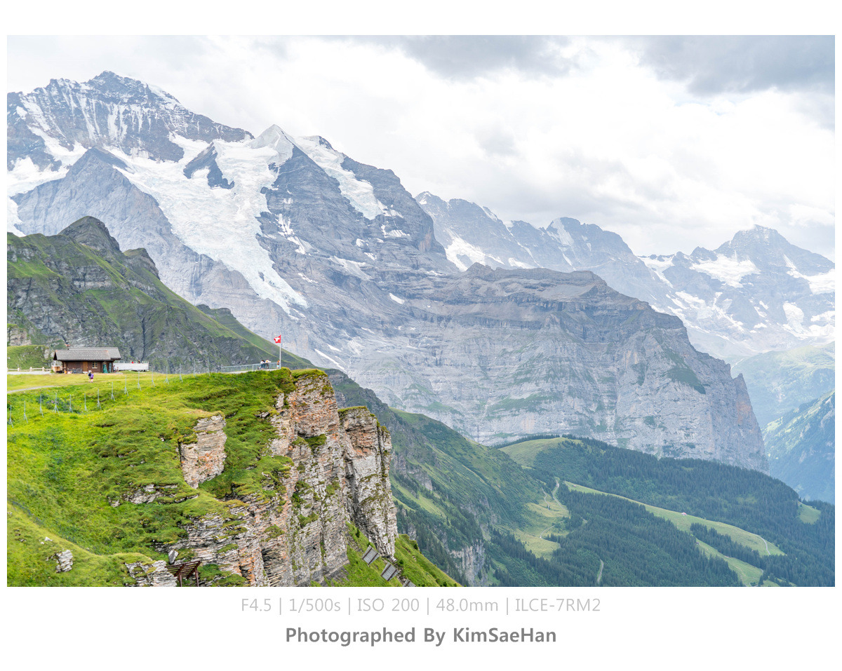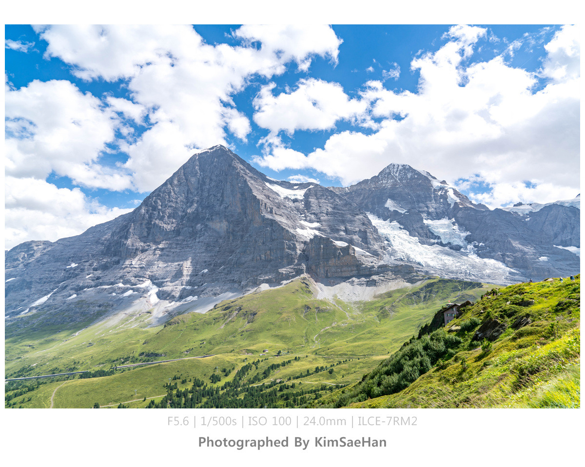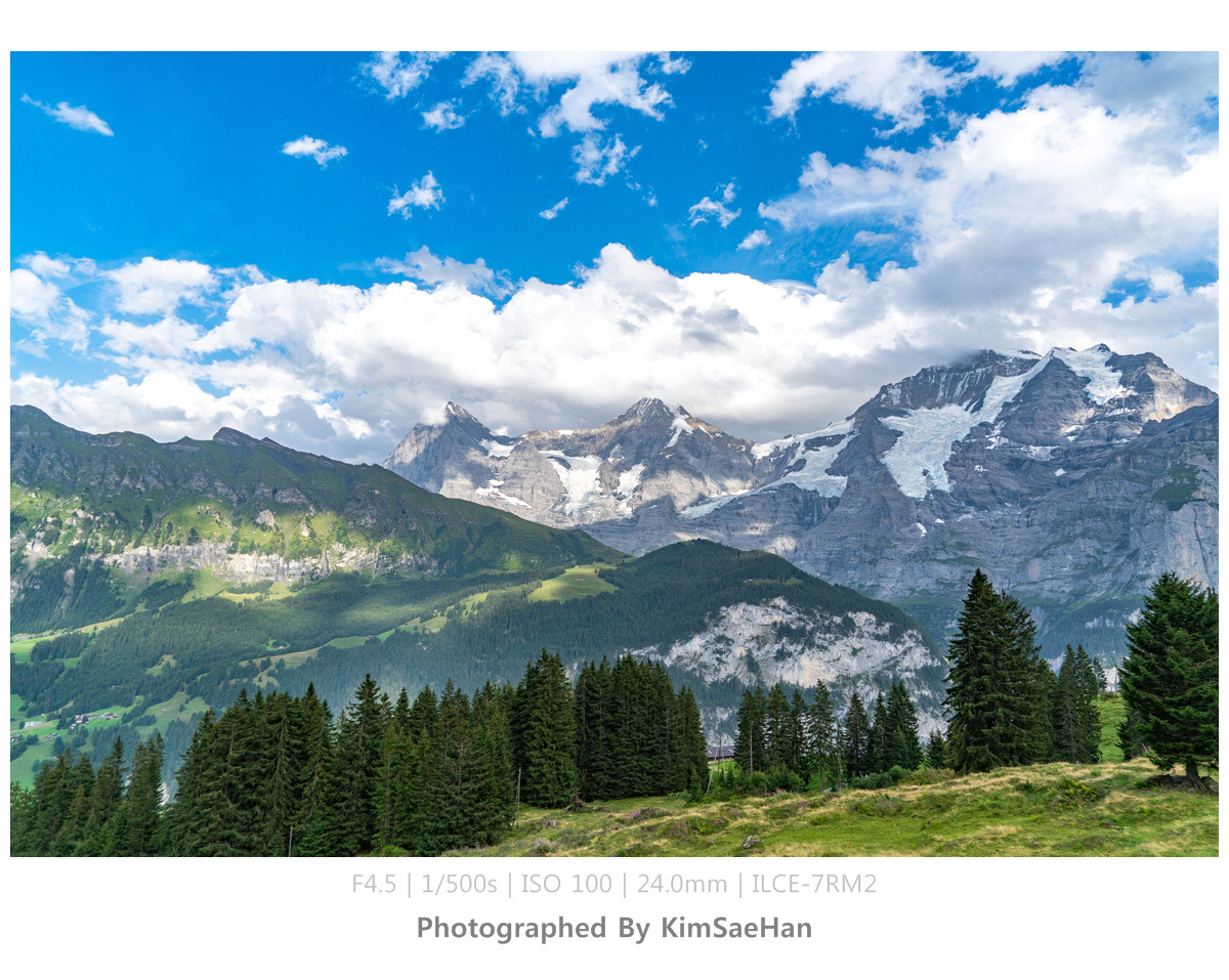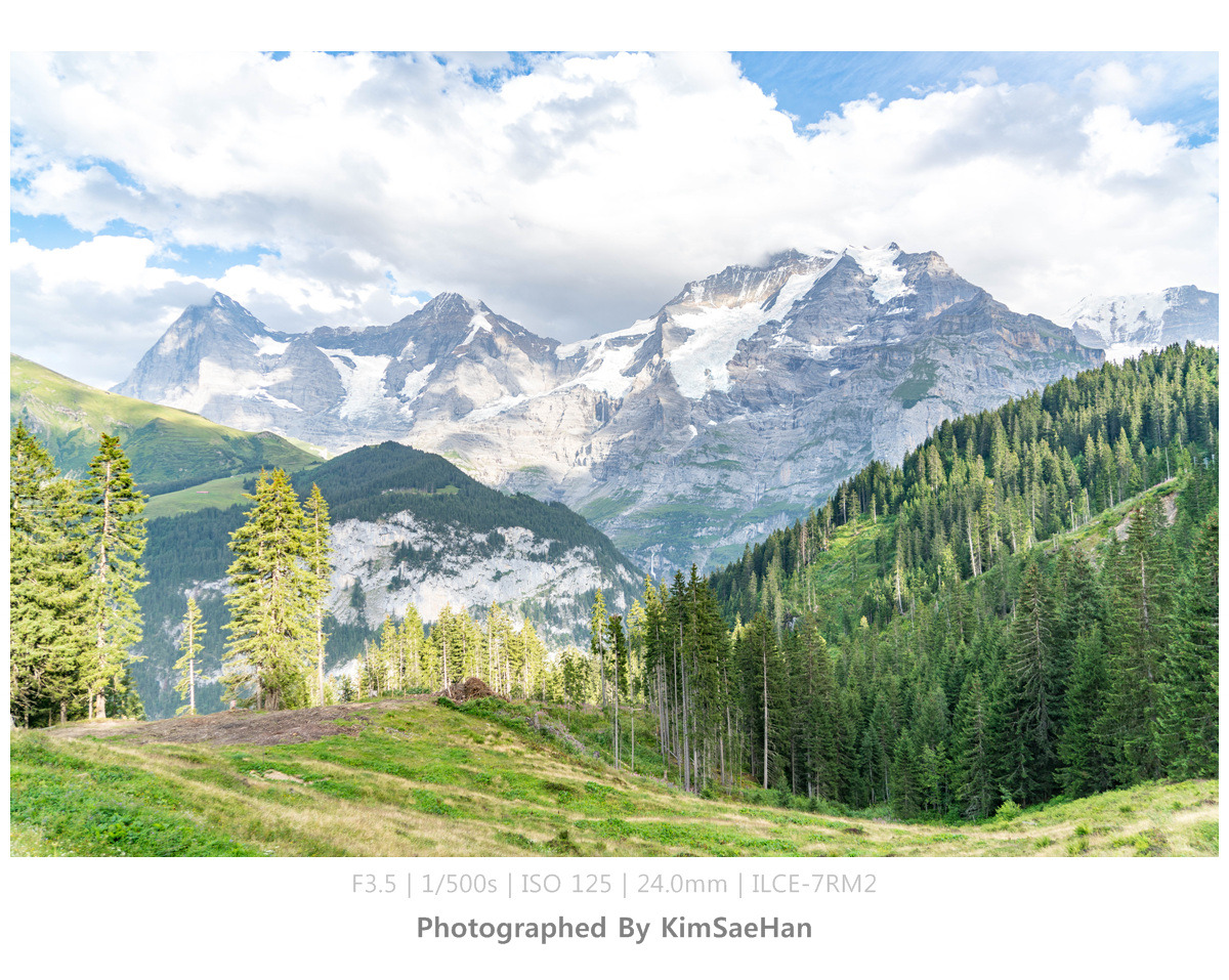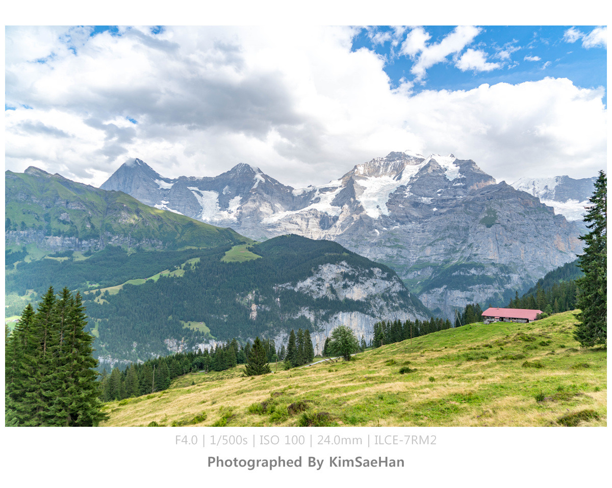그림 같은 길을 따라 천천히 걸어서 뻥 뚫린 풍경을 바라보며 걷다 보면, 어느새 꼭대기에 도착하게 된다. 고개를 왼쪽으로 돌리면 그린델발트가 보이고, 오른쪽으로 돌리면 벵엔이 보인다. 또 눈 앞에 3개의 봉우리가 보인다. 특히, 융프라우는 장관이다.