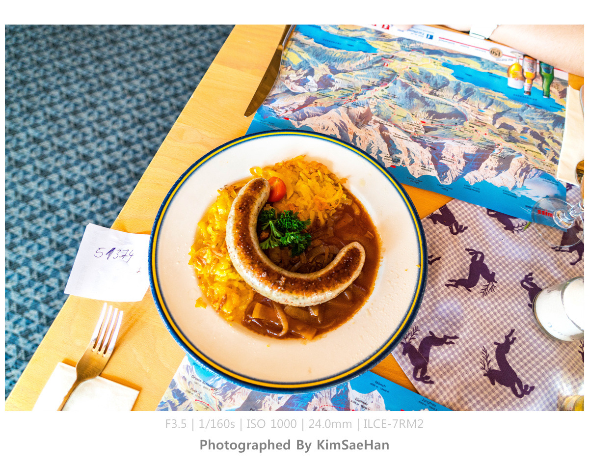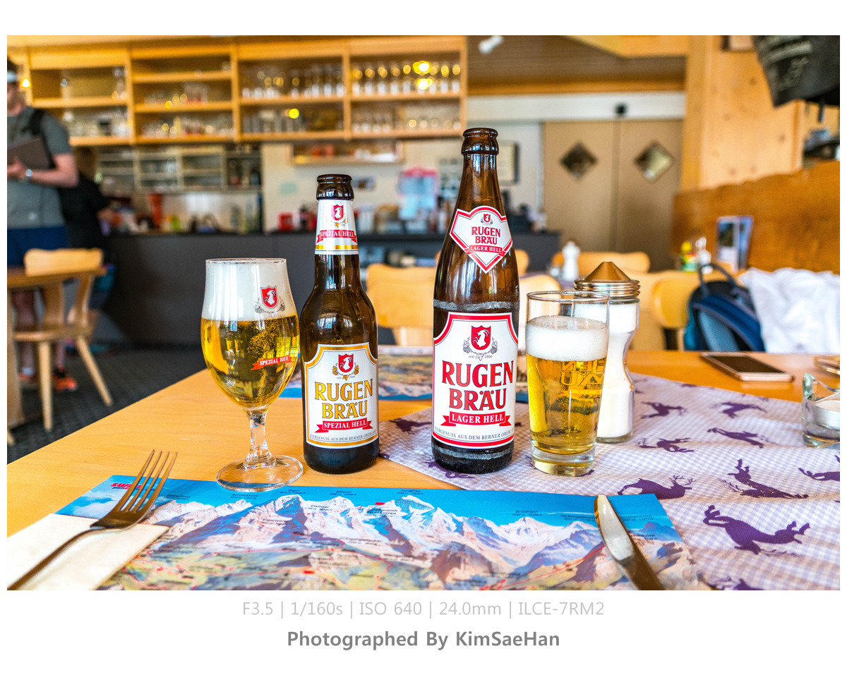 사진도 찍고 하다 보니, 이번에도 1시간 30분이 초과되었다. 그래도 너무너무 좋은 길을 걸었더니 힘들지도 않았다. 멀리 클라이네샤이덱 역이 보이는데 아쉽기까지 했었다. 코스 끝나는 지점 근처에 레스토랑이 있는데, 여기에서 경치를 바라보며 시원한 맥주와 간단한 식사를 하기로 했다. 취리히에서 먹었던 감자전 맛이 나는 뢰스티와 소시지를 먹기로 했다.