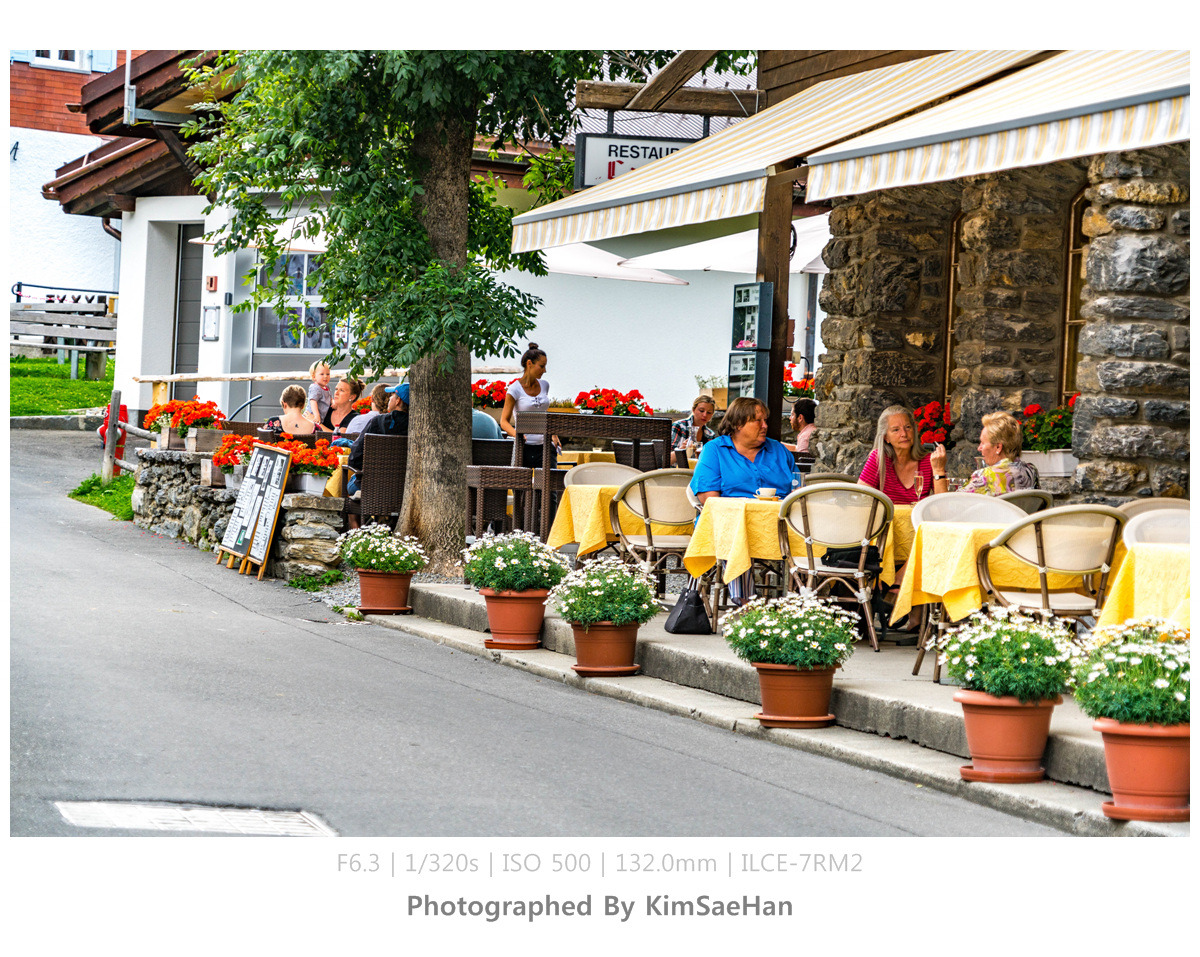 뮈렌에 도착하자마자 제일 먼저 마지막 기차 시간을 확인했다. 라우터브루넨까지 돌아가는 케이블카까지 생각하니 2시간 정도 여유가 있었다. 산속에 있는 마을이기 때문에 사람들이 별로 없을 줄 알았는데, 그래도 관광객들이 어찌 알고 많이 찾아왔다. 뮈렌 마을도 역시 대부분 레스토랑과 호텔들이 많았다.