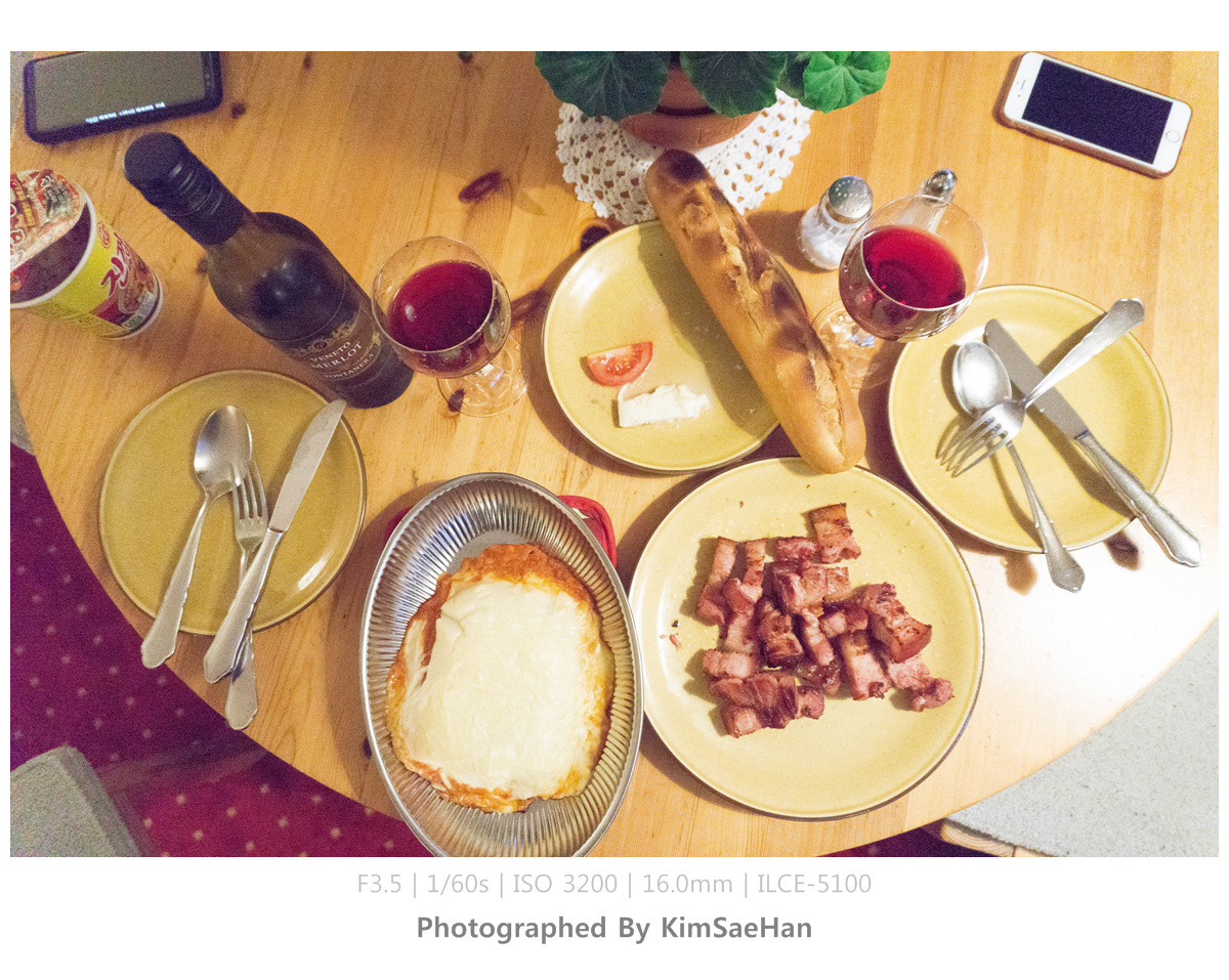 처음 사용해보는 조리기구들과, 부족한 도구들로 인해 생각보다 저녁시간이 많이 지체되었지만 그래도 한상 가득 차려놓고 보니 푸짐했다. 그린델발트에서 샀던 와인을 드디어 여기에서 오픈을 하고 맛있는 저녁식사 시간을 가졌다.