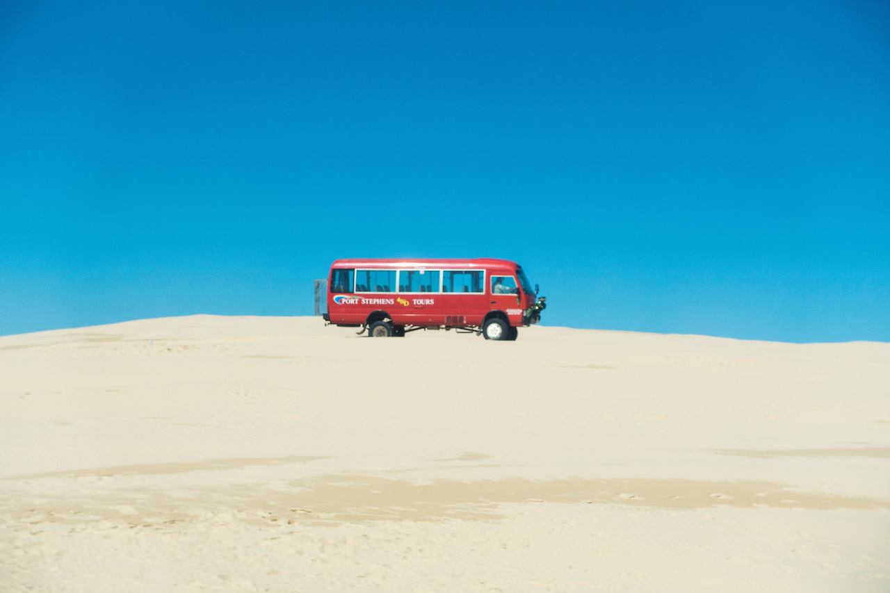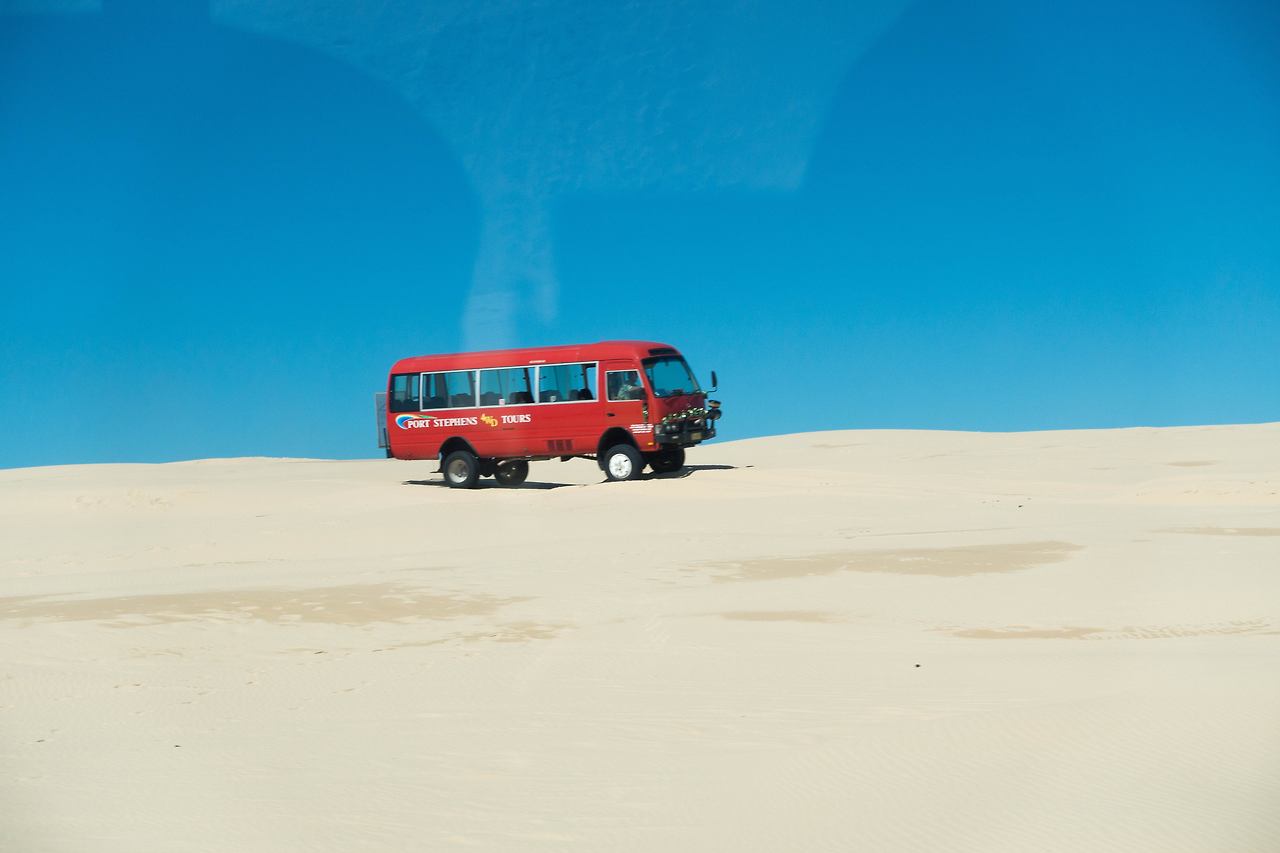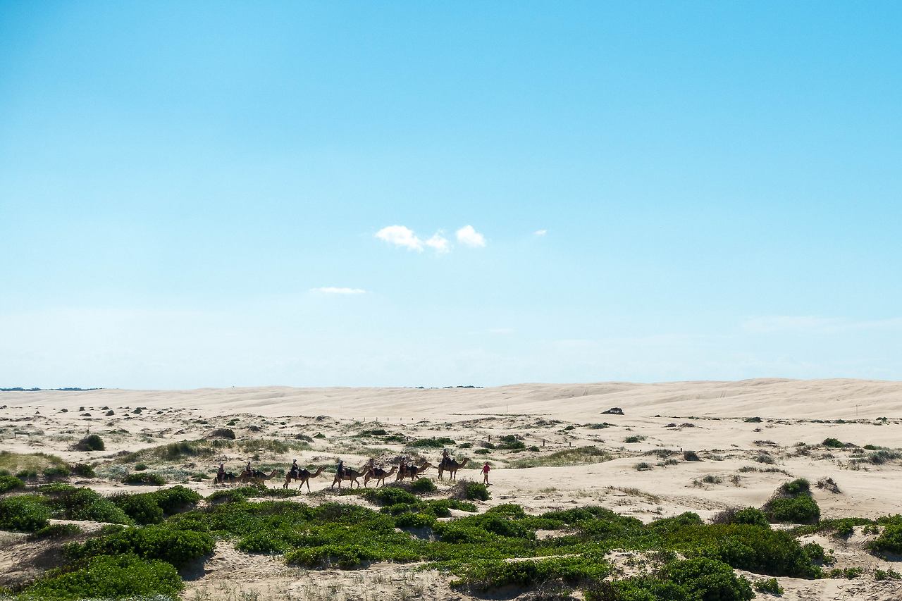 아쉬운 마음을 뒤로하고, 다시 항구로 돌아왔다. 버스에 탑승하자 오늘의 메인인 포트 스테판을 하러 출발했다. 호주에서 사막투어라니 신기했지만, 막상 목적지라고 도착한 곳을 보니 더욱 신기했다. 왼쪽에는 바닷가와 해변이 있고 오른쪽에는 바로 사막이 있었다. 난 사막은 내륙 쪽에만 있는 것이라 생각했는데, 바로 옆에 바닷가가 있으니 그냥 넓은 모래 해변은 아닐까란 의심도 했지만, 때마침 눈앞에 낙타들이 무리 지어가는 것을 보고, 사막이 맞다고 인정할 수밖에 없었다.