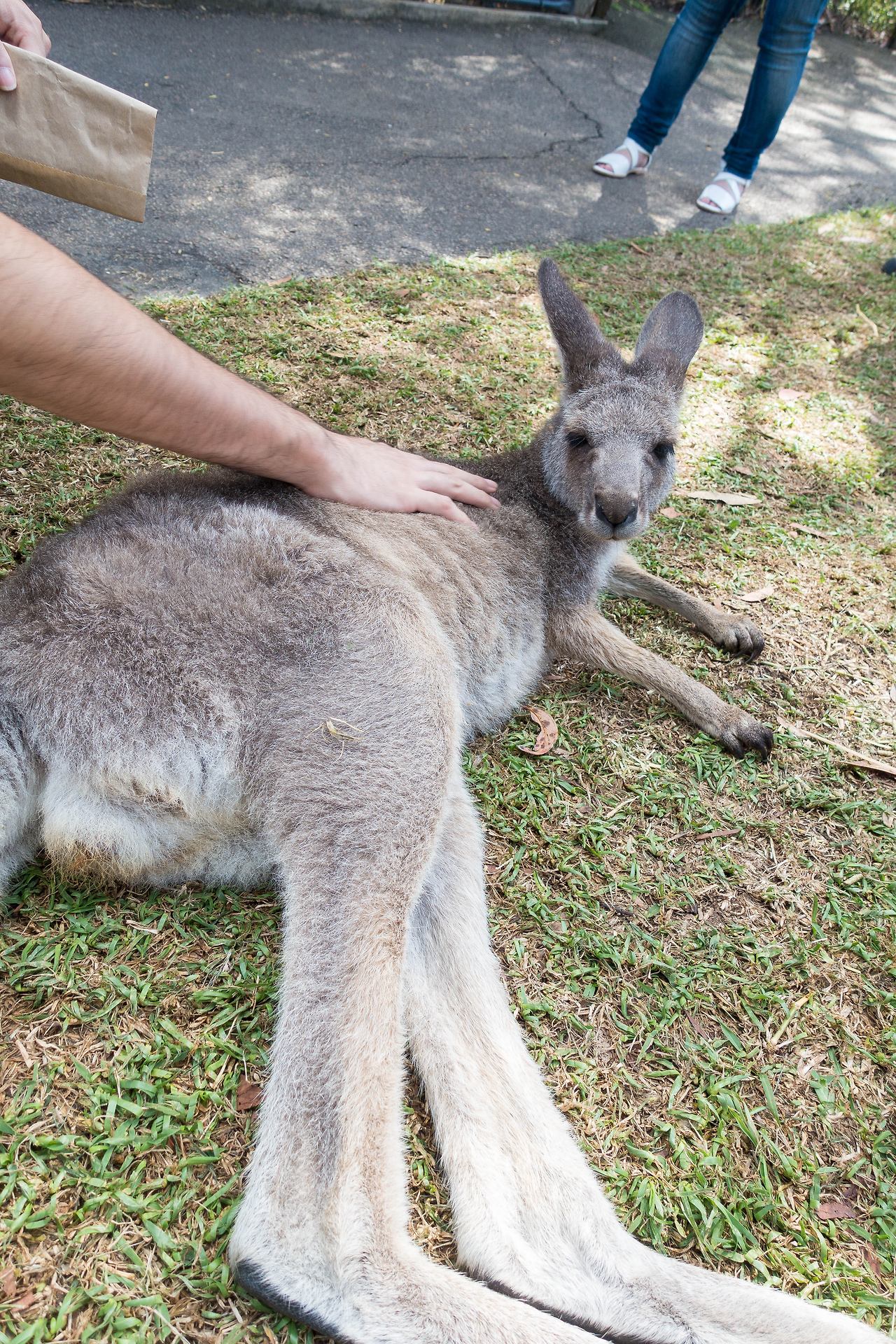 지루해 질려던 찰나 나타난 녀석 덕분에 이내 사람들이 몰리기 시작했다. 도망가지 않고 먼저 사람에게 다가가기도 하고 사람들의 손을 피하지도 않았다. 탈출한 녀석이 아닌 동물원에서 이렇게 풀어둔 녀석 같았다. 이미 사람 손을 많이 타서 그런지 여러 사람이 만져도 그냥 가만히 누워서 즐기고 있을 뿐이었다. 그러다 사육사가 먹이를 나눠주길래 받아서, 입에 가져갔더니 손에 있던 먹이를 순식간에 먹어 해치웠다.