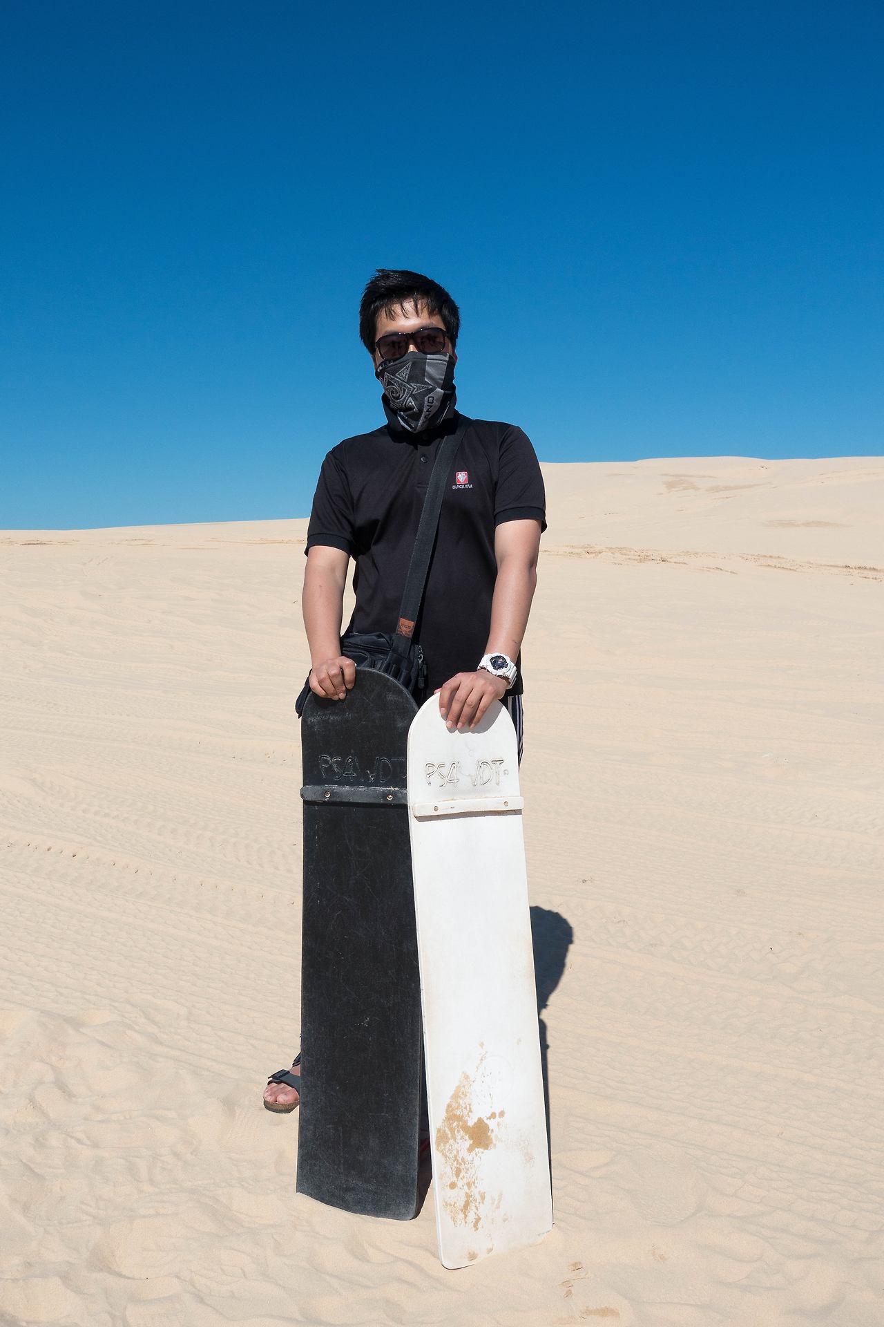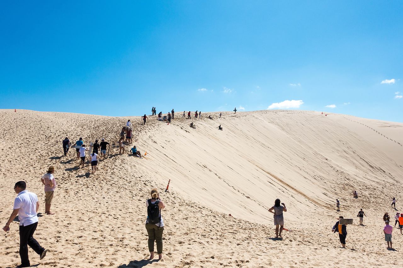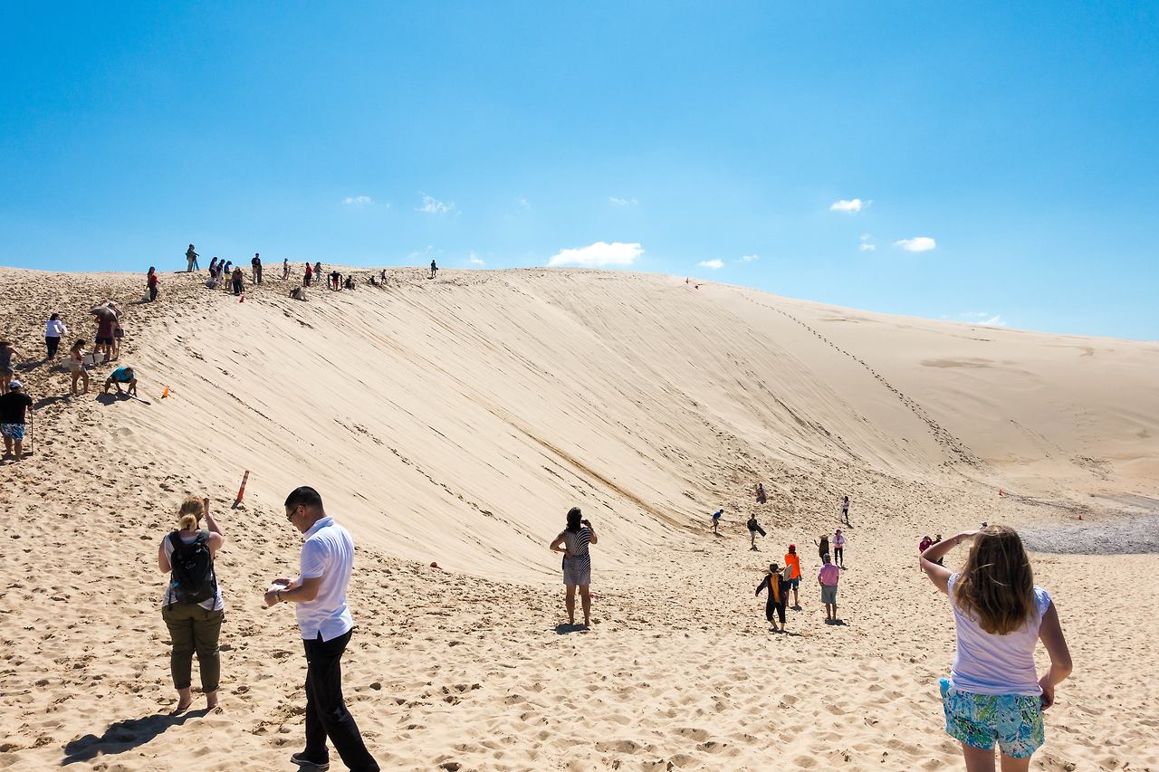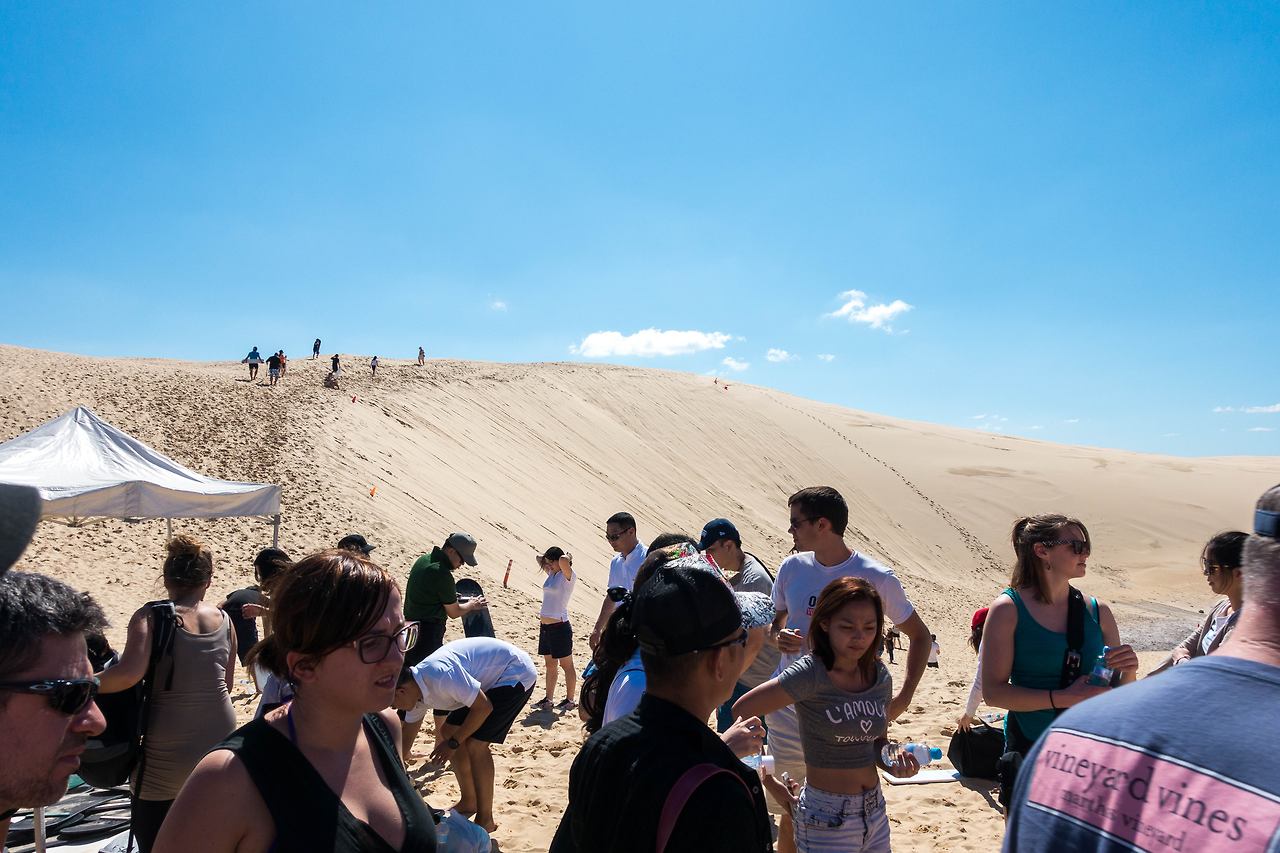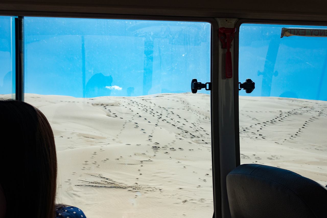 포트 스테판은 사막에서 보드를 즐길 수 있어서 유명한데, 타는 곳까지 특수 개조된 차를 타고 이동해야 했다. 차량에 탑승해서 울퉁불퉁한 사막 위를 질주해서 목적지에 도착하자, 큰 모래 언덕이 있었다. 가이드의 설명을 듣고, 보드판을 하나씩 받아서 열심히 타러 올라갔다.