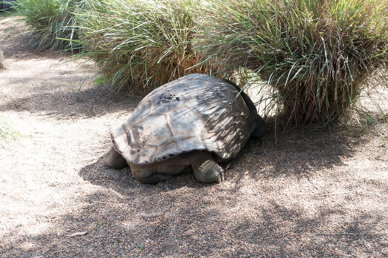 그리고 바로 옆 우리에는 코끼리 거북 한 마리가 있었다. 처음에는 큰 바위구나 싶어서 가다가 다리가 있는 게 이상해서 봤더니 거북이였다. 그늘 밑에서 쉬고 있는데, 행동도 굼뜨고 그래서 보는 이로 하여금 답답하게 만들었지만, 저 덩치를 짧은 다리로 움직이는 것도 힘들어 보였다.