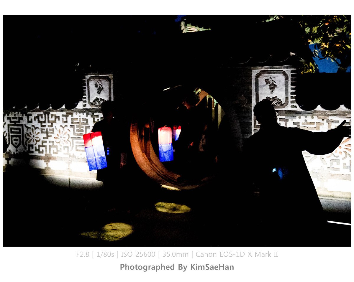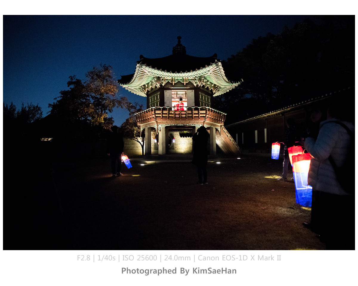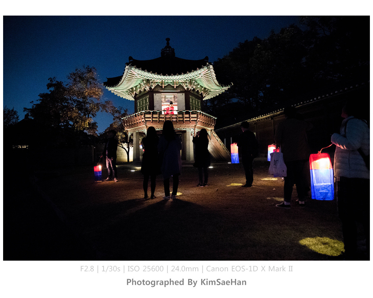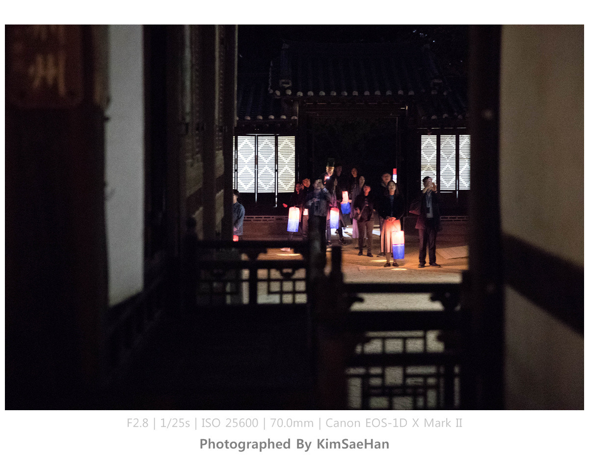 문이 천천히 열리면서, 달빛 기행 투어의 시작을 알린다. 곧 안내해주시는 분이 나와서 설명을 해주시는데 1조부터 시간을 두고 입장을 한다. 워낙 어둡기 때문에, 입장할 때 조당 청사초롱을 하나씩 지급해준다. 그렇게 밝은 편은 아니지만 멀리서도 보이는 불빛 때문에 예쁘기는 했다.