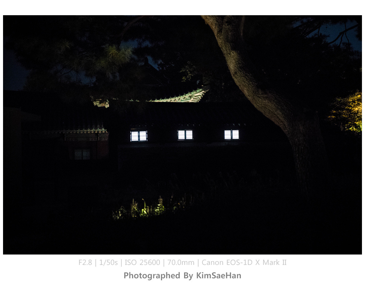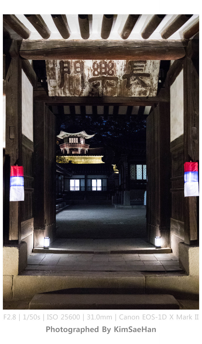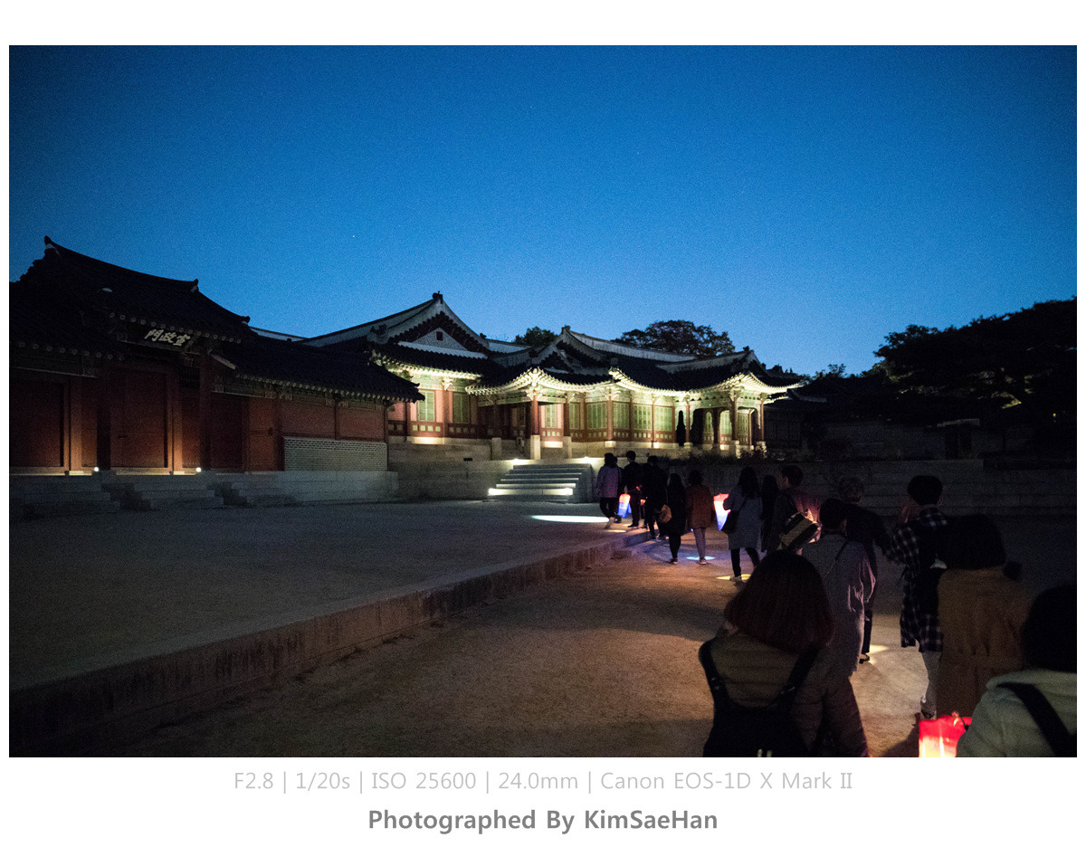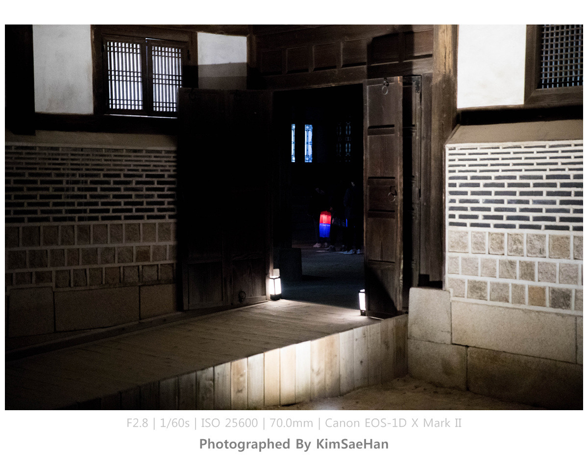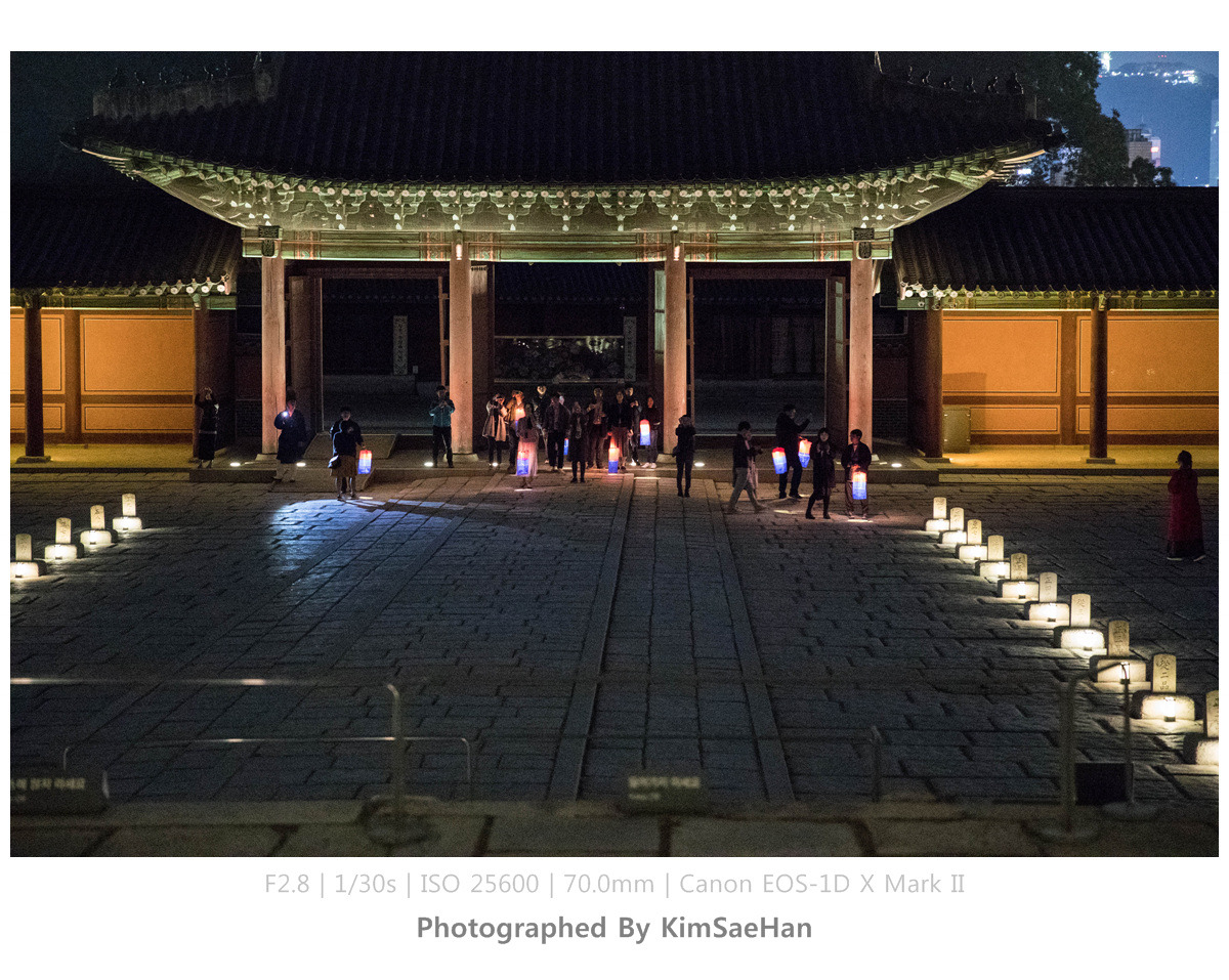 문이 천천히 열리면서, 달빛 기행 투어의 시작을 알린다. 곧 안내해주시는 분이 나와서 설명을 해주시는데 1조부터 시간을 두고 입장을 한다. 워낙 어둡기 때문에, 입장할 때 조당 청사초롱을 하나씩 지급해준다. 그렇게 밝은 편은 아니지만 멀리서도 보이는 불빛 때문에 예쁘기는 했다.