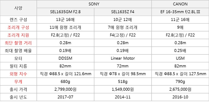 여기서 한 가지 집고 가야 할 부분이 있다. SEL1635GM 렌즈에 대한 글인데, 왜 캐논과 비교를 하는 것이냐고. 캐논을 쓰는 유저들은 소니 렌즈에 대해서 고민할 필요가 없다. 소니 렌즈를 캐논에서 사용할 수 있게 도와주는 어댑터는 없기 때문이다. 하지만, 반대로는 가능하기 때문에 나처럼 캐논과 소니를 같이 쓰는 유저라던지, 아니면 캐논에서 소니로 넘어오면서 렌즈군에 대해서 고민을 하는 사람들이 있기 때문이다.
