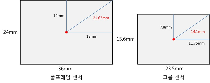 풀프레임용 렌즈와 크롭 렌즈의 MTF 차트에서 X축 차이는 왜 발생하는 것일까. 바로 센서의 크기 때문에 그렇다.