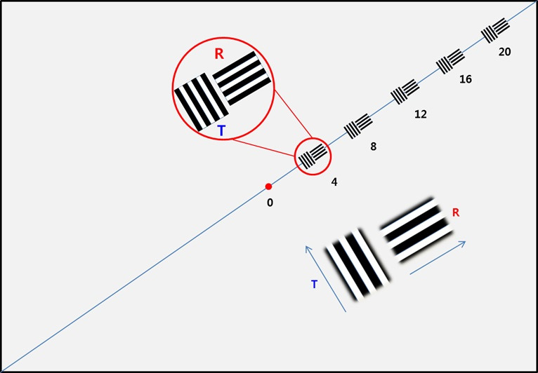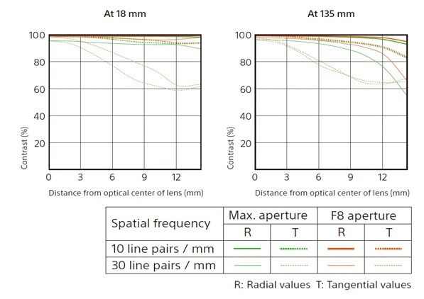 R (S, Sagital)은 Radial Value(실선, 방사선 방향), T(M, Meridional)는 Tangential Value(점선, 동심원 방향)의 약자인데, 10 lp / mm와 30 lp / mm를 R과 T 방면으로 배열하고 이미지의 밀림 정도를 가지고 이미지 품질을 수치화 할 수 있다.