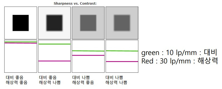 위의 그림이 매우 설명이 잘 되어 있다. 차트 상에서 위에 같이 나란히 붙어 있는 것이 아주 우수한 것이고, 차트의 아래 부분으로 내려갈수록 (MTF 차트의 Y 축 값이 100% 아닌 아래 구간) 대비와 해상력이 나쁘다는 것을 알 수 있다.