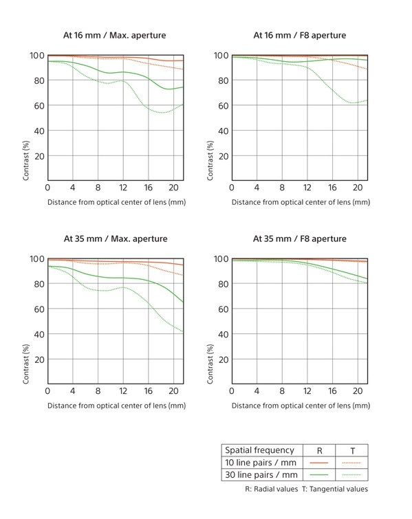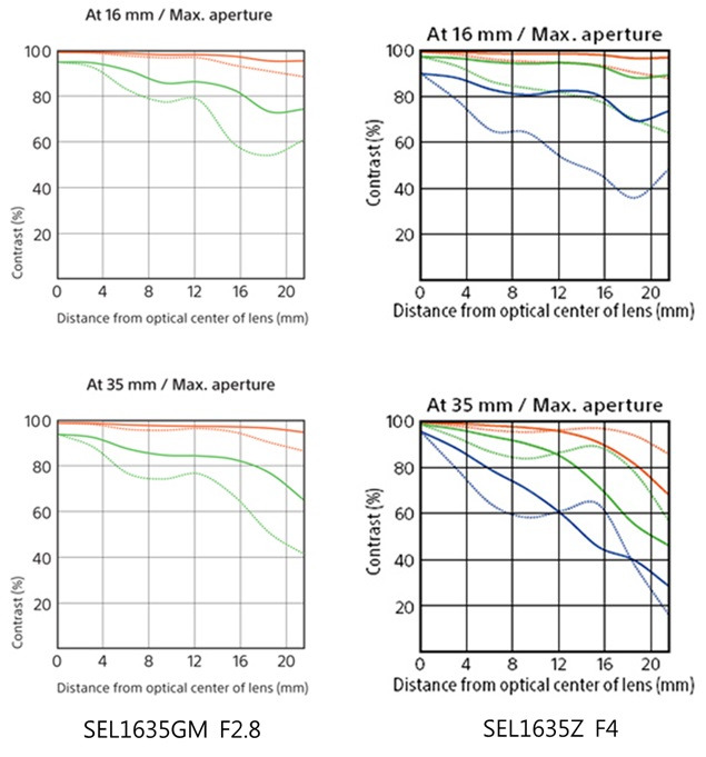 35mm 구간의 MTF 차트를 보면, 눈에 바로 구분이 될 정도로 SEL1635GM이 우수하다는 것을 볼 수 있다. 이러한 차이가 단일의 결과물로서는 확인하기 힘들지만 서로 비교하면 확연한 차이를 보여주기 때문에 우리는 지갑을 열게 되는 것이다.