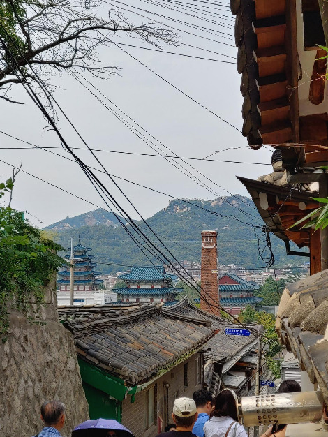 오래된 주택과 멀리 보이는 궁궐 사이에 목욕탕 굴뚝이 보인다. photo by_윤씨