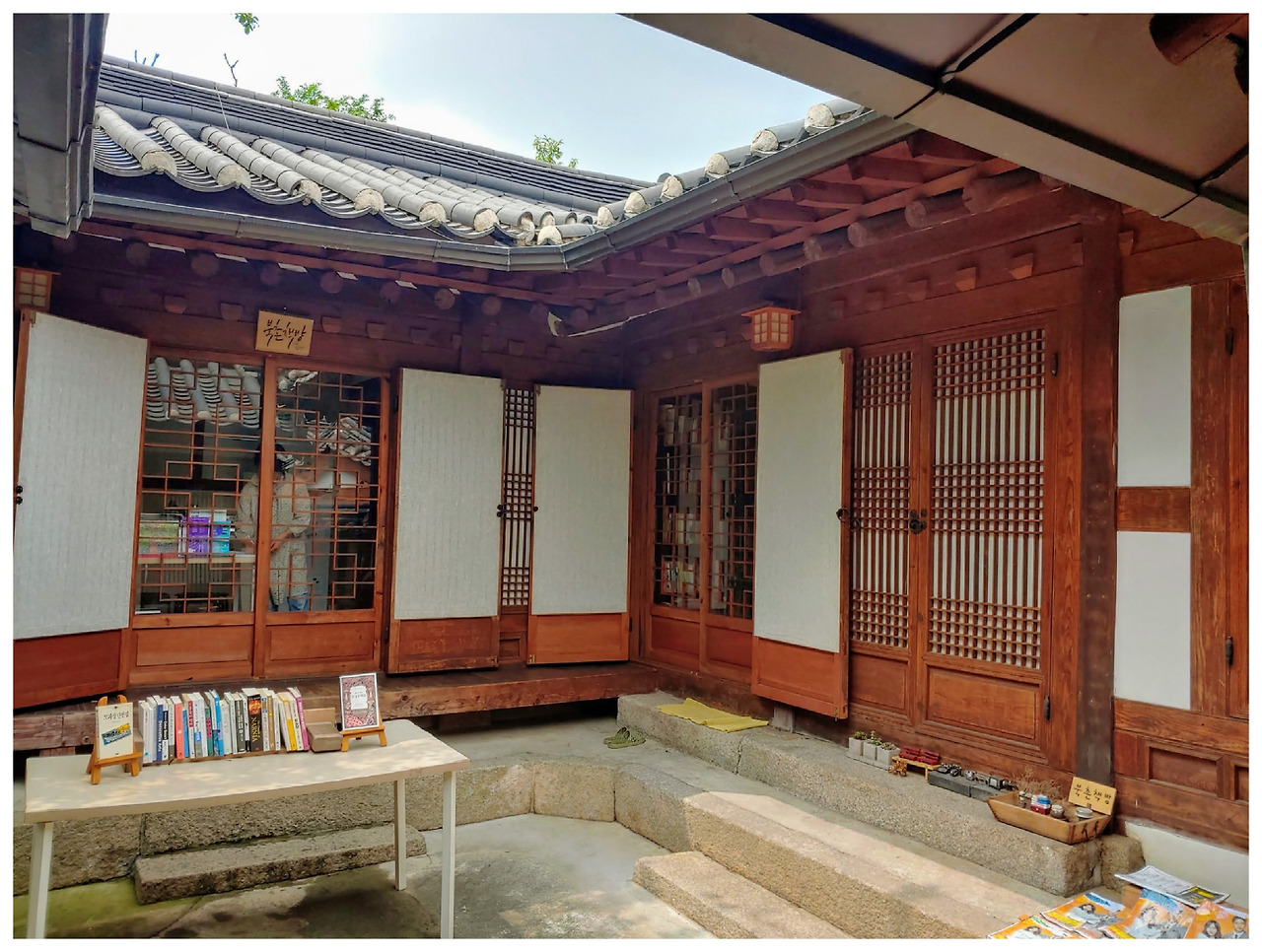 길모퉁이를 돌면 대문이 나온다. 나무로 만든 단아한 문패를 다시 한번 확인하고 문지방을 넘어서면, 한옥의 정취가 한껏 묻어나는 아담한 마당이 나타난다. 마당 한편에는 책들을 늘어놓은 책상이 서 있었다.