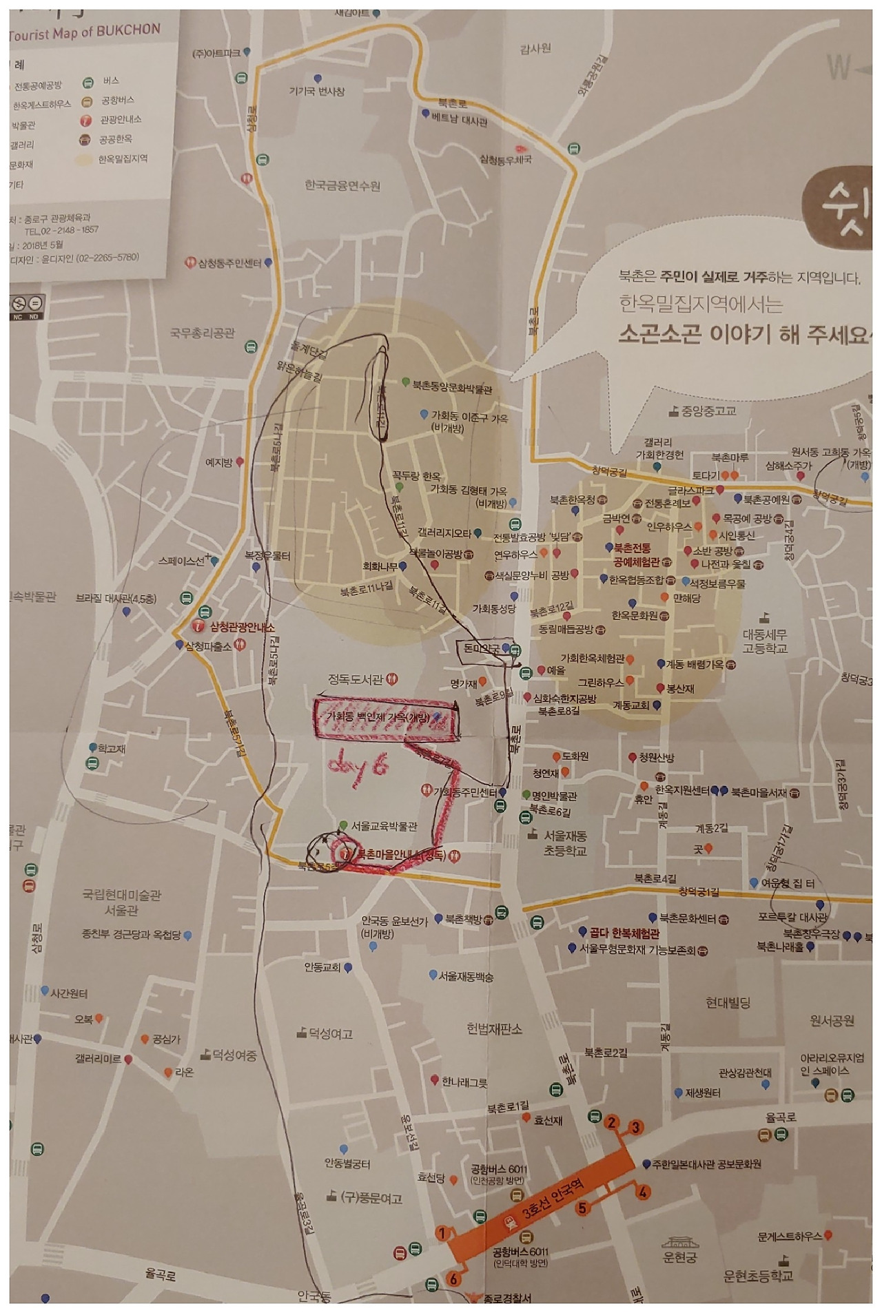 그렇게 조심스러운 설명을 뒤로하고, 안내소 직원분이 지도를 펼쳐 북촌마을 길을 알려주신다. 골목길을 따라서 가회동 백인제 가옥을 먼저 가보라고 하셨다. 그리고는 큰길로 나와서 다시 돈미약국 골목으로 들어간 뒤, 거기부터 한 바퀴 주욱 돌아 나오면 된단다. 시간은, 한 바퀴 도는데 30분 정도면 될 거라 하셨다. 지도는 전에 받았던 것과 같은 지도이지만, 직접 펜으로 그려가며 길을 알려주셨기 때문에 그냥 받아 나왔다.