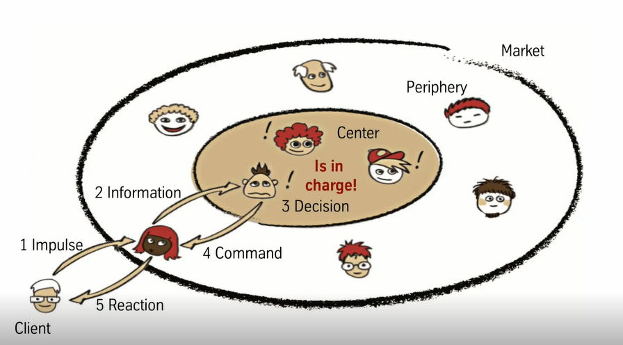 피라미드 조직에는 고객과 시장이 드러나지 않는다. 최상증과 바닥, 관리자와 직원만 있을 뿐 이것이 기존의 모든 피라미드 조직도가 가진 근본 결함 중 하나이다!