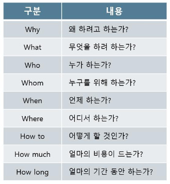 뿐만 아니라 과제 실행 계획을 세울 때도 6W3H를 사용하여 필요한 주요 항목의 누락을 사전에 방지하고, 완성도를 높여준다.