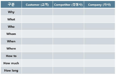 Competitor(경쟁사) 관점은 경쟁사의 강점 및 약점은 무엇인가? 에 대한 질문에 대한 대답이다. 그리고 이를 통해 경쟁사와 차별화 할 수 있는 방안은 무엇인가를 찾는 것이다.