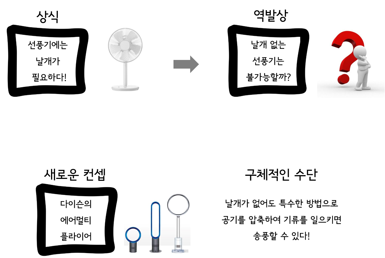 다이슨의 '날개 없는 선풍기'를 만든 역발상의 대표적인 사례이다.
