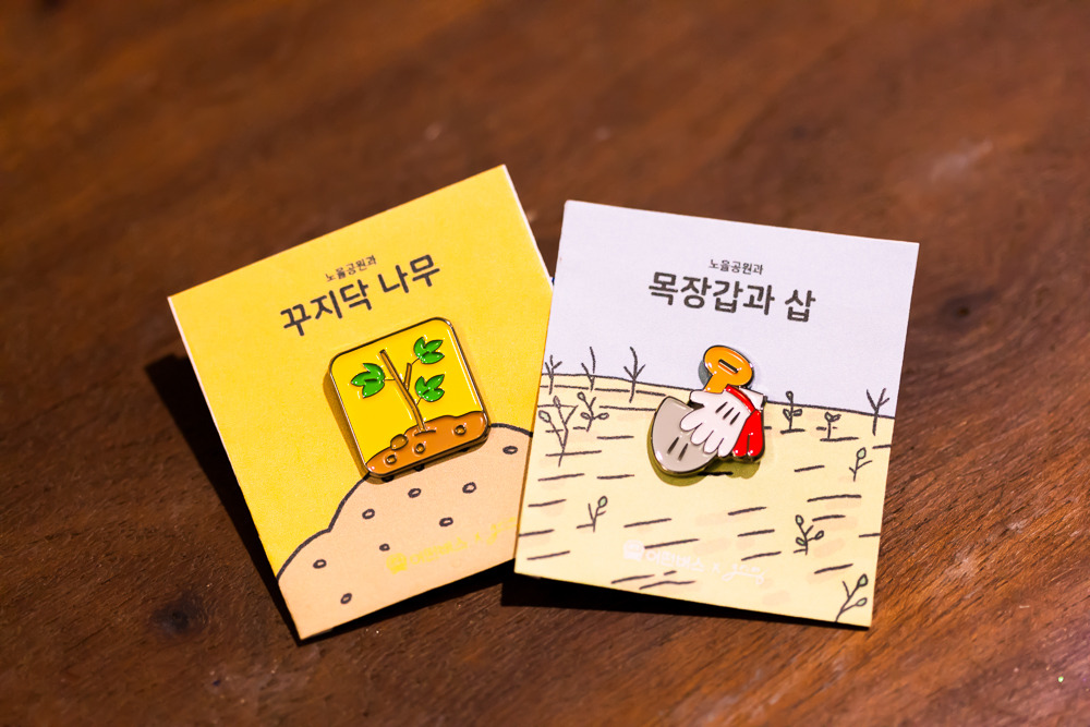 저희는 작은 프로젝트를 하나 시작하게 되었습니다. 노을공원 회복에 손을 보태고 싶지만 시간적, 공간적 제약으로 인해 참여가 어려우셨던 분들이 간접적으로 동참하실 수 있도록 기회를 마련해 보았는데요. 노을공원을 상징하는 것(꾸지닥 나무, 삽, 장갑)들을 뱃지, 엽서 등으로 만들어 판매하고 그 수익금을 노을공원시민모임에 기부할 생각입니다.