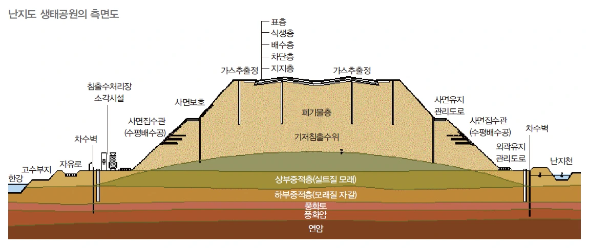매립지를 중심으로 오염하수(침출수)의 한강 유입을 막고자 방벽을 두껍게 둘러쳤으며, 제1 매립지는 ‘노을공원’ 제2 매립지는 ‘하늘공원’으로 조성하며 평화의 공원 등과 더불어 월드컵공원지구를 만들게 됩니다.