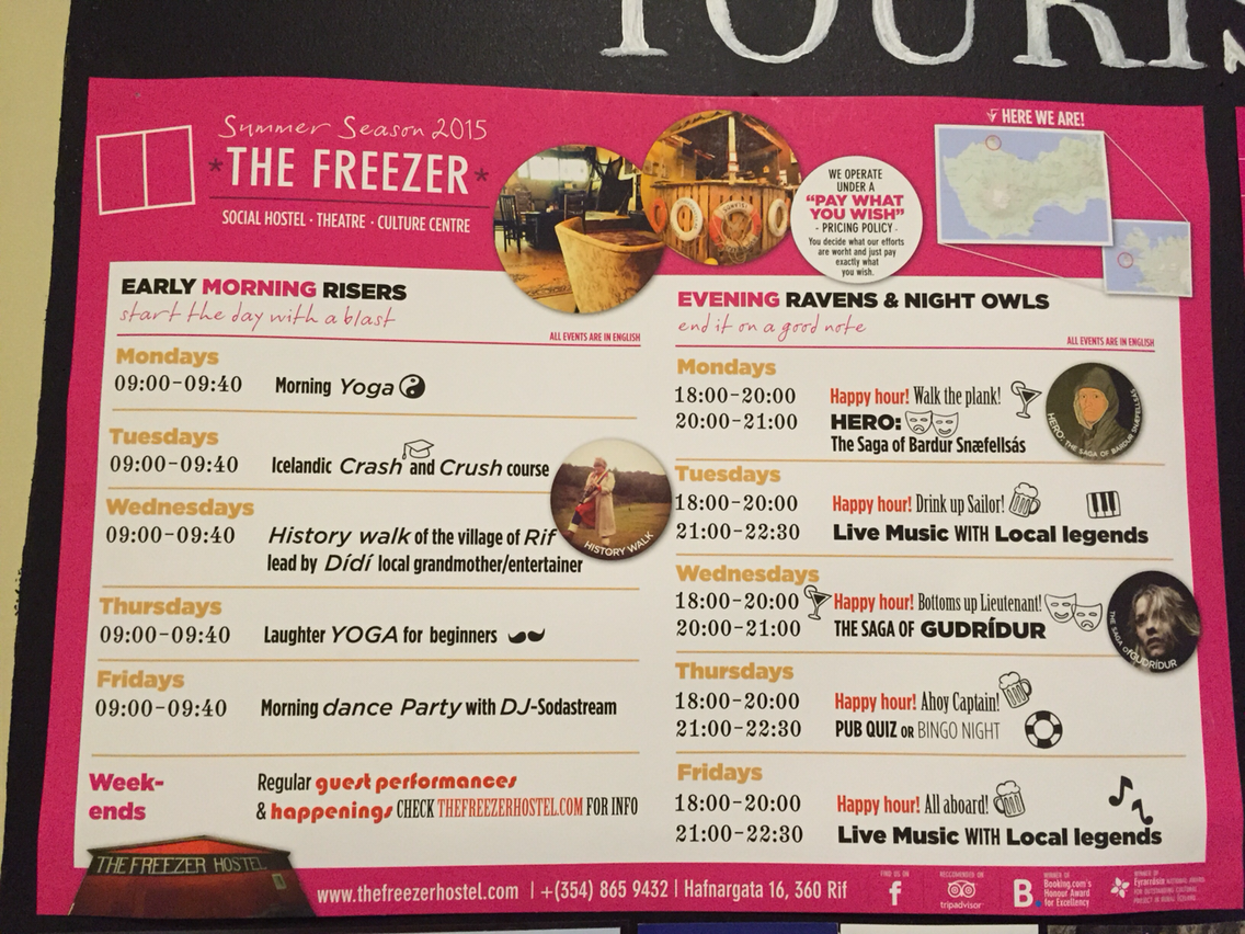 계획에 없던 The Freezer를 찾게 된 건, KEX 호스텔 복도에 붙어 있던 이 포스터 때문이었다. KEX의 분위기에 흠뻑 빠져 5일이나 묵었더니, 공연장이 숙소라 매일 아침저녁으로 공연과 문화생활을 경험해 볼 수 있다는 이 소셜 호스텔의 포스터가 마음을 사로잡았다. KEX의 직원들에게 물어봐도 '잘 모르겠다. 유명하지 않은 곳이다', '차가 없으면 대중교통으로는 찾아가기 힘들다'고 했다. 복도를 지나갈 때마다 눈길을 사로잡았던 이 포스터... 차도 없고, 일정도 만만치 않고... 포기해야 하나? 그런데 레이캬비크를 떠나 북쪽의 미바튼 까지 여행하는 일주일간의 여행길에 이 포스터가 간간이 눈에 들어왔다. "서울로 돌아가면 완전히 다른 문화의 직장에서 새로운 방식으로 일해보자는 마음을 다지려 떠난 특별한 여행인데, 여기서 미련을 남겨야 하나? 아니다. 직장도 때려치웠는데, 그냥 지르는 거다. 후회는 남기지 말자." 그래서 결국 여행 마지막 일정에 비싼 비용으로 자동차를 렌트하고 하루 종일 운전을 해, 이 허름하지만 나에겐 더없이 매력적인 호스텔로 향했다. 배보다 배꼽이 더 큰 지출이었지만, 지르고 보니 만족도는 몇 배 이상이었다.