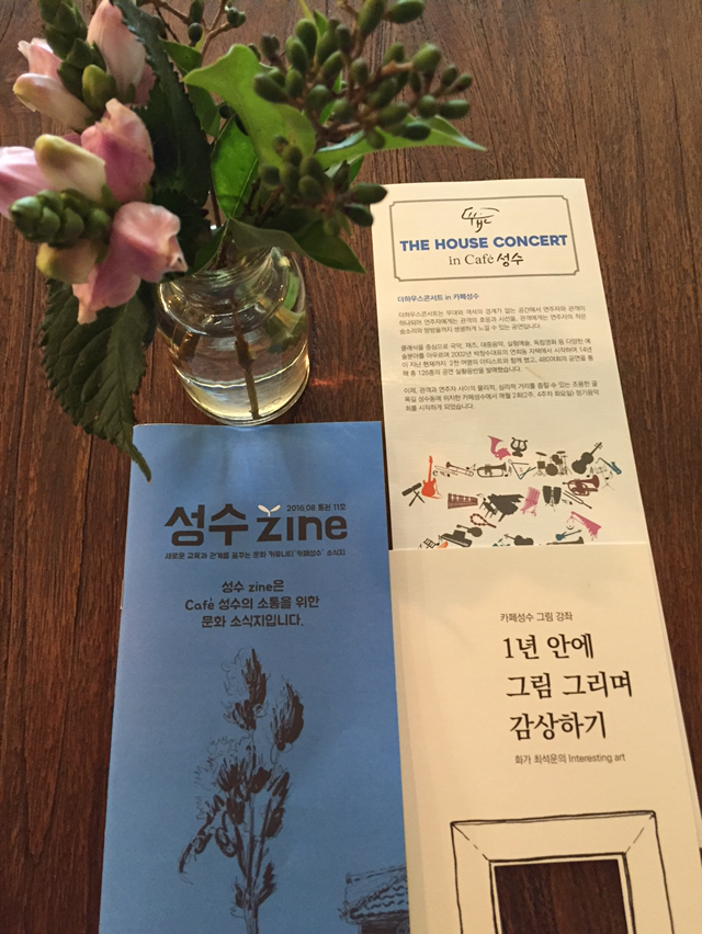 카페성수를 오늘의 아지트로 삼은 건 바로 이 곳이 청강문화산업대학교의 문화실험 장소이기 때문이다. 지하에 자리 잡은 협탁에 놓인 브로슈어 몇 개를 들었더니, 이곳의 소식지와 더불어 워크샵과 문화수업들이 소개되고 있다. 매달 2,4번째 화요일 저녁에는 바로 이곳에서 'The House Concert'가 정기적으로 열린다. 2002년 박창수 대표님의 자택에서 시작한 자택 콘서트가 이젠 서울, 전국의 작은 공간에서 정기적으로 열리는 콘서트로 자리 잡았는데, 여기서 다시 보게 되어 반가웠다. 일상을 놀이로 살 수 있는 동네 커뮤니티를 만들어가는 사람들이 있어 서울의 삶도 점점 더 재미있어지는 듯하다. '시가 있는 하루'라는 프로그램은 한 권의 시집을 정해서 함께 시를 낭독하는 필사하는 프로그램이다. '1년 안에 그림 그리며 감상하기'는 1년 동안 화가와 함께 그림 그리기를 연습하고 1년이 되면 카페 성수에서 그 그림들을 전시하는 프로그램이다. 이 외에도 다양한 프로그램들이 부담 느끼지 않고 참여할 수 있도록 소소하게 소개되고 있다.