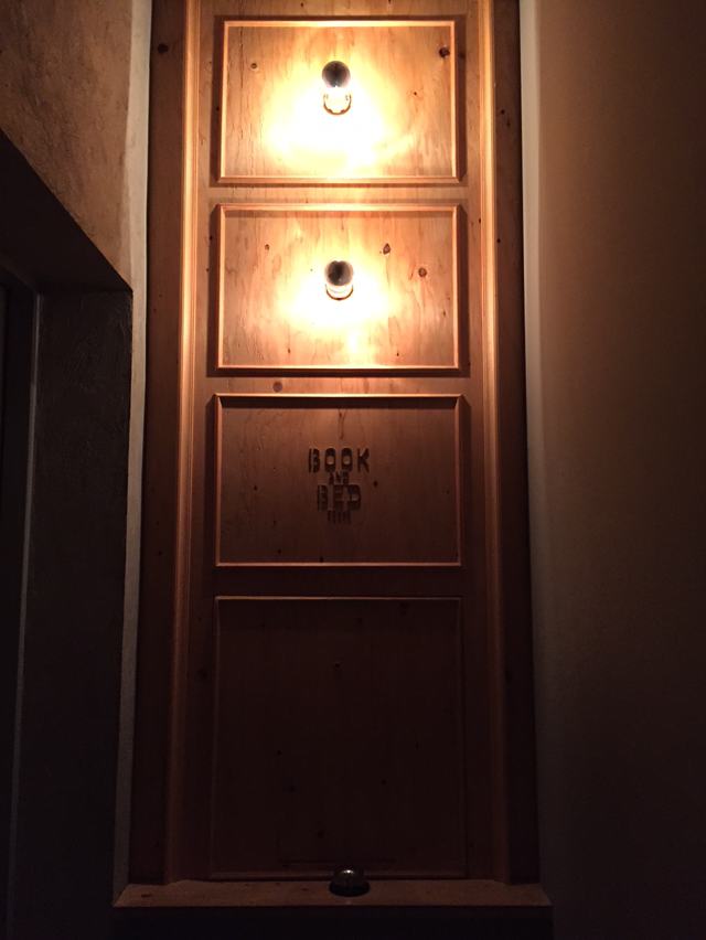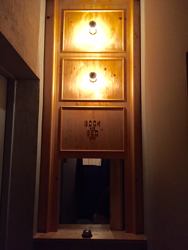 '띵' 엘리베이터 멈춤 소리와 함께 열린 7층. '응?' 내리자마자 한걸음 앞에 문 하나 달랑 잠겨져 있고, 좌우로 두 걸음씩 남은 공간. 오른쪽에는 음료자판기 하나, 왼쪾은 Book&Bed 로고가 적힌 나무 장식과 벨 하나. 호텔 리셉션에 가면 손바닥으로 치면 '땡'소리가 나면서 직원이 나타나는 그 은색 벨이 있었습니다. 입구를 잘못 찾았나 하면서 혹시 몰라 눌러봤더니, 깜짝 놀라게 나무 장식 3칸짜리에 마지막 칸이 열리고 고개가 쑤~욱 나오면서 예약을 했냐고 물어보네요. 이때부터 즐거움이 시작됐습니다. 옛날 영국 탐정 드라마에 나오는 듯한, 궁금증이 확 몰려오는 거죠. 빌딩 숲 한가운데 벨소리와 함께 예상치 못한 전혀 낯선 공간이 열리면서 새로운 세계에 초대된다는 느낌?