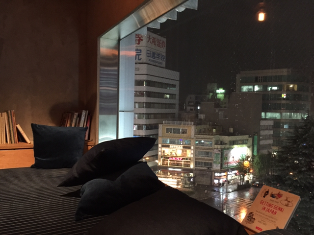 그래서 도전해봤죠. 비가 주룩주룩 내리는 창가 자리에 누워서 뒹굴뒹굴 한국어로 이미 마스터한 일본 만화책, 가족과 함께 일본에 살게 된 미국인 아줌마가 겪은 문화적 차이를 재미있게 써 내려간 에세이, 도쿄의 지역별 특색을 생생하게 그려낸 일러스트 책. 이 세 권이 북앤베드에서 저와 함께 한 책들입니다. 4시가 조금 넘어 체크인을 했는데, 새벽 두 시까지의 시간이 전혀 지루하지 않았어요. 생각보다 너무 깨끗한 공용시설, 마음을 편안하게 해주는 음악소리. 책 읽는 여행자들을 위해 소음을 내지 않으려는 사람들의 작은 배려. 드러눕기가 전혀 꺼려지지 않을 정도로 깨끗한 소파. 그리고 비가 내려 빗방울 자국을 계속 만들어 내는 창가. 북앤베드의 풍경이 별 움직임 없이 조용하고 느리게 흐르고 있다면, 창밖의 풍경은 정말 달랐어요. 네온사인이 번쩍이는 도심 속. 고개를 밑으로 내리면 움직이는 자동차 헤드라이트와 신호등의 껌뻑이는 불빛이 생동감을 더해줍니다. 지루하지도 않을 뿐 아니라, 저렇게 바삐 움직이는 바깥세상에서 한 발자국 안으로 들어왔더니 이렇게 책 읽으면서 조용하게 보낼 수 있는 공간이 있다는 게 참 신기했습니다. 그러다 시계를 보니 새벽 두 시. 어느새 옆 자리에서 책을 읽던 사람들 대부분이 조용히 샤워를 하고 서가 뒤로 사라졌네요. 한두 명이 여전히 남아서 책장을 넘기는 소리만 들립니다. 살짝살짝 눈꺼풀이 나도 모르게 내려앉았다 올라감을 느끼다, 아쉽지만 저도 서가 뒤로 사라지기로 했습니다. 아쉬운 마음에 누워서 책을 더 읽다가 책을 펼쳐놓은 채로 잠이 들었습니다.