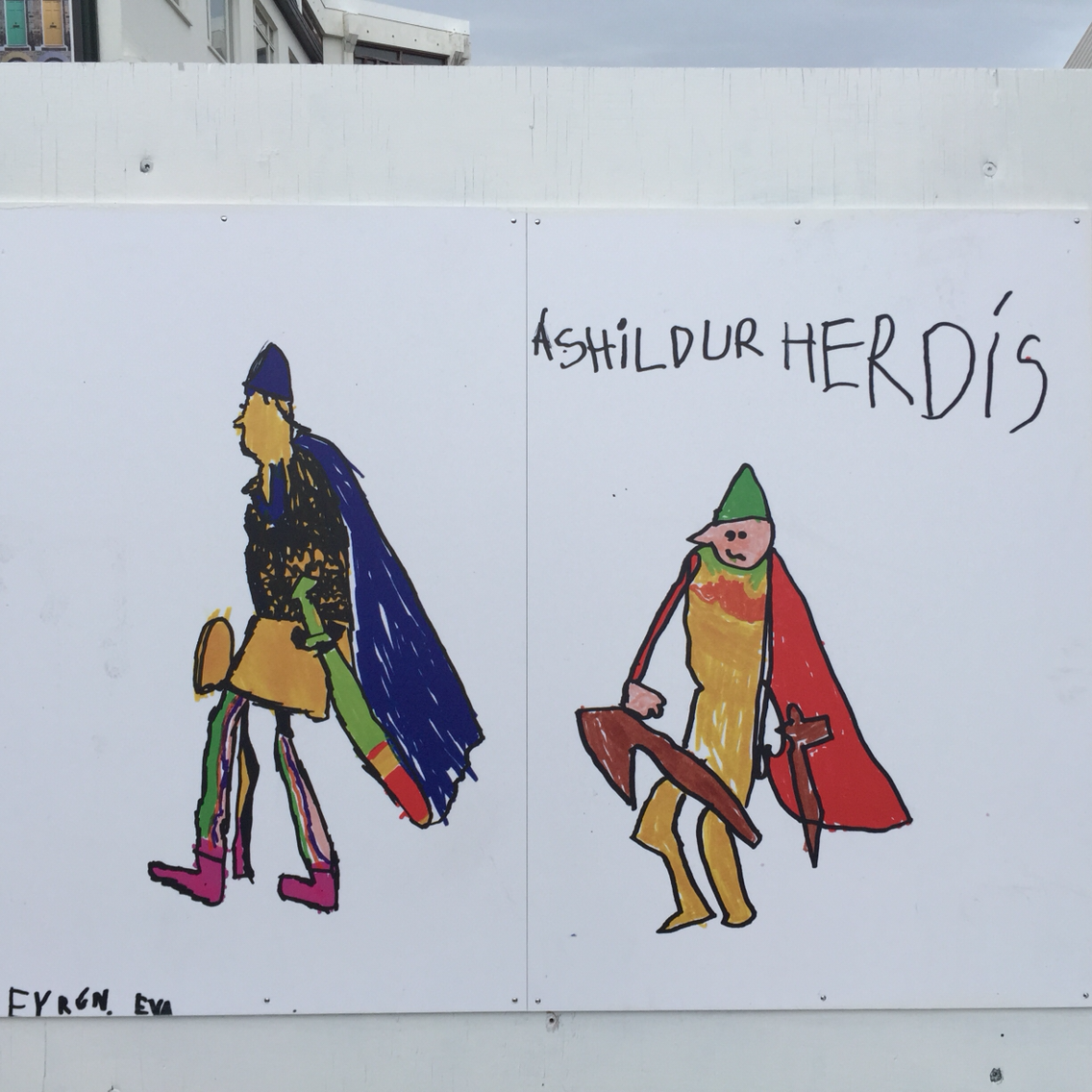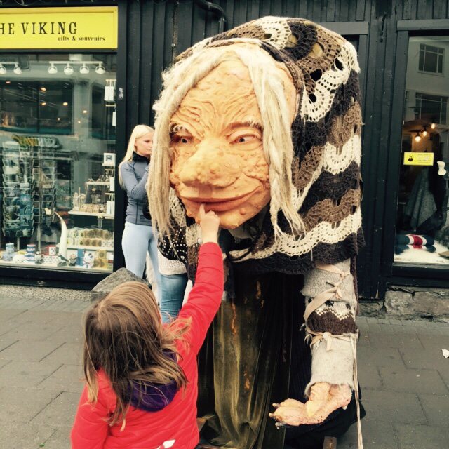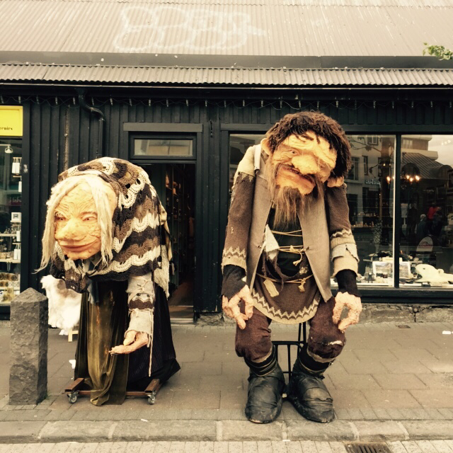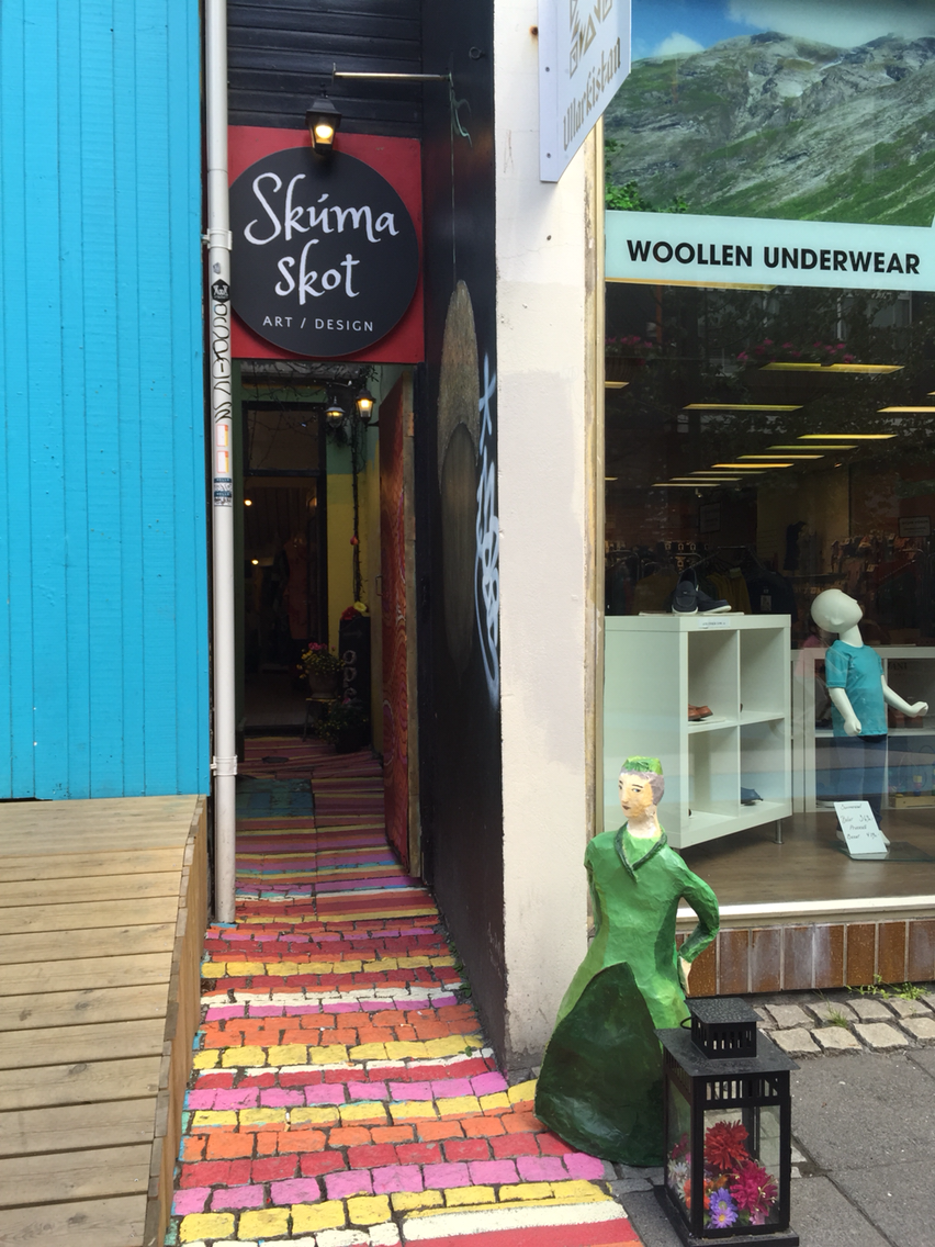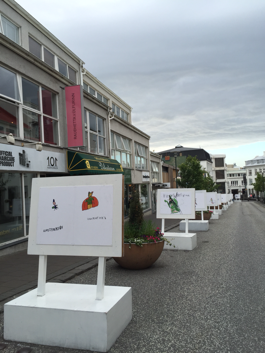 교회 정문에서 언덕 아래로 큰 길이 나 있다. 여기를 내려오다 보면 각종 샵과 길거리 전시전을 볼 수 있다. 전래동화 속 거인 트롤의 이야기가 아직도 아이들을 무섭게 하는 아이슬란드다. 내가 찾은 날에는 동네 아이들이 꼬마손으로 그린 트롤과 민화 속 주인공들이 나름의 총천연색으로 길거리에 즐거움을 안겨다 주고 있었다. 어쩌면 그렇게 상상력이 뛰어나고 색을 선택하는 데 거침이 없는지, 크기도 제멋대로 비율도 제멋대로 선도 삐뚤삐뚤한 그림들을 보면서 언덕을 내려가다 보니, 조카들 생각도 나고 입가에 절로 핏 하고 실 웃음이 나온다. 언덕을 끝까지 내려가니 레이캬비크 최대의 쇼핑거리 뢰이가베구르 거리와 만난다. 이곳 상점 앞에서 거대한 부부 인형을 만났다. 그 앞을 지나가던 꼬마 어린아이 한 명... 엄마 손을 잡고 머뭇머뭇하다가 용기를 끄집어내서 할머니 인형 입술에 손가락 한번 대보더니 저리 도망가버린다. 무서워하는 걸 보니 아직 아기인 듯. 저 때가 좋았는데...