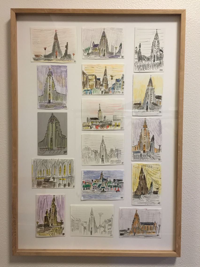 제주도에서 본 주상절리가 아이슬란드에서도 많이 보인다. 이 외관은 특히 마을 아이들과 주민들의 단골 그림 대상이다. 교회에는 주민들이 자신만의 시각으로 그린 교회의 드로잉이 전시되어 있다. 나도 모르게 어느새 손바닥만 한 노트를 꺼내서 줄을 죽죽 그으면서 나만의 할그림스키르캬를 그려본다. 교회에 엘리베이터가 있어 이용료를 내고 꼭대기에 올라 시내를 관망할 수 도 있고, 교회 정문 앞에는 탐험가 레이퓌르 에이릭손의 동상이 있다. 교회를 둘러싸고는 아기자기만 쉼터와 카페들이 있어, 야외 데크 의자에 앉아 교회를 바라보고 드로잉 해보는 것도 재미있다.
