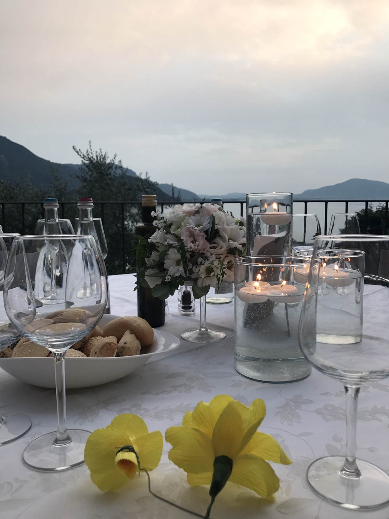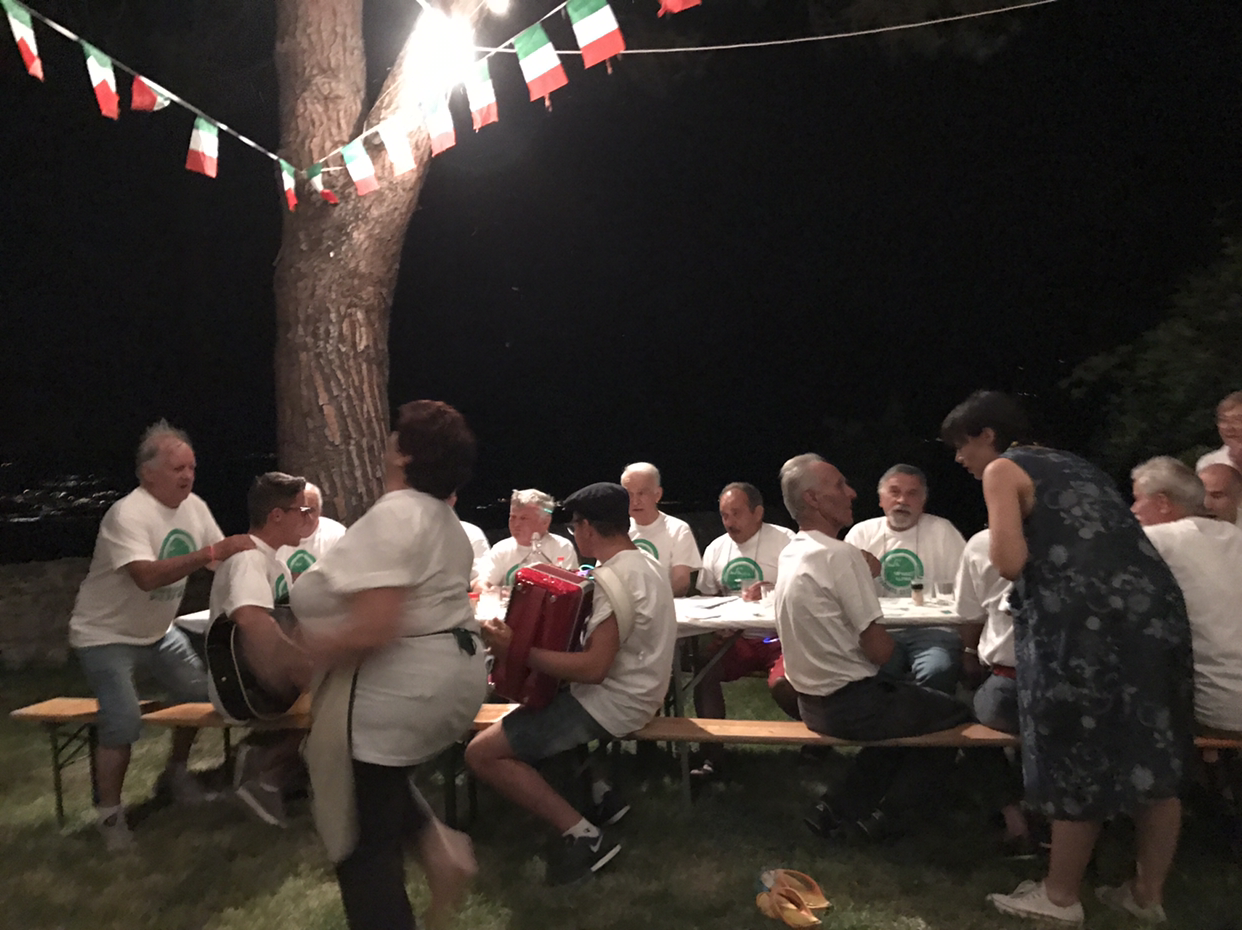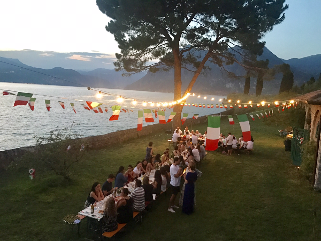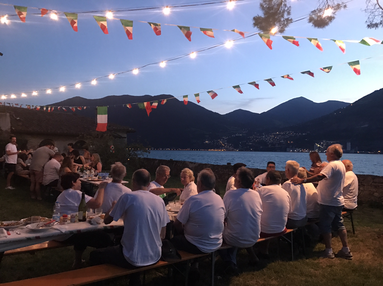 그날 밤 내가 꿈꾸던 이태리 영화의 한 장면이 펼쳐졌다. 나무에는 꼬마전구와 이탈리아 국기가 길게 늘어져있다. 긴 나무 테이블엔 와인잔과 식전빵이 일렬로 줄지어 세팅되어 있다. 나이 지긋한 이태리 할아버지들이 식전주를 드시면서 아코디언과 기타 반주에 맞춰 이태리 민요를 합창한다. 스프릿츠를 들고 호숫가 해지는 풍경을 바라보며 듣는 라이브 음악. 행복하다.