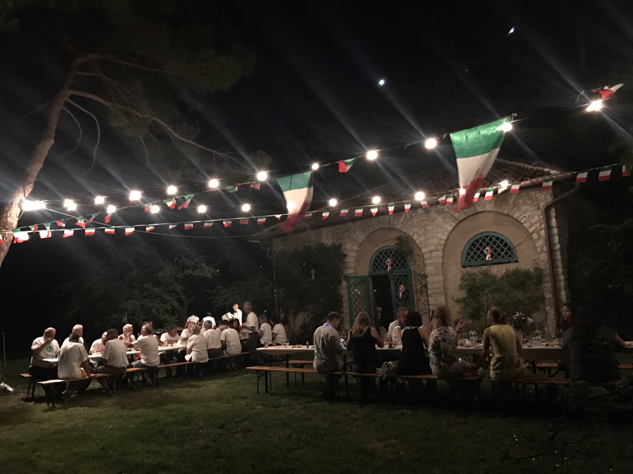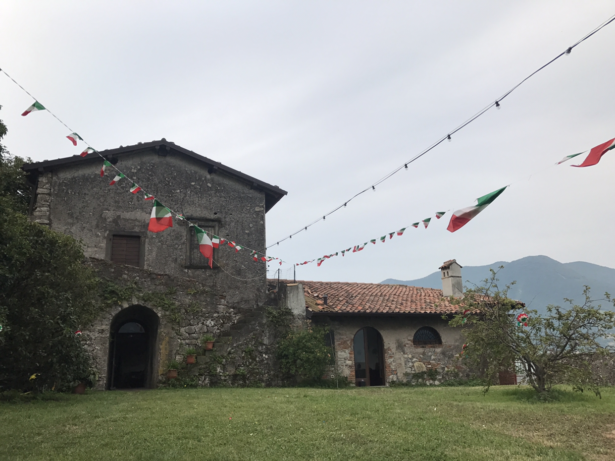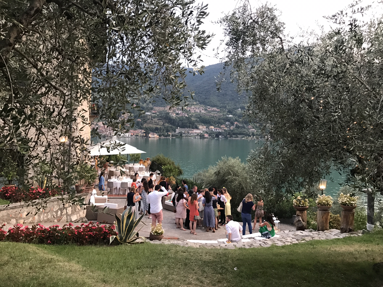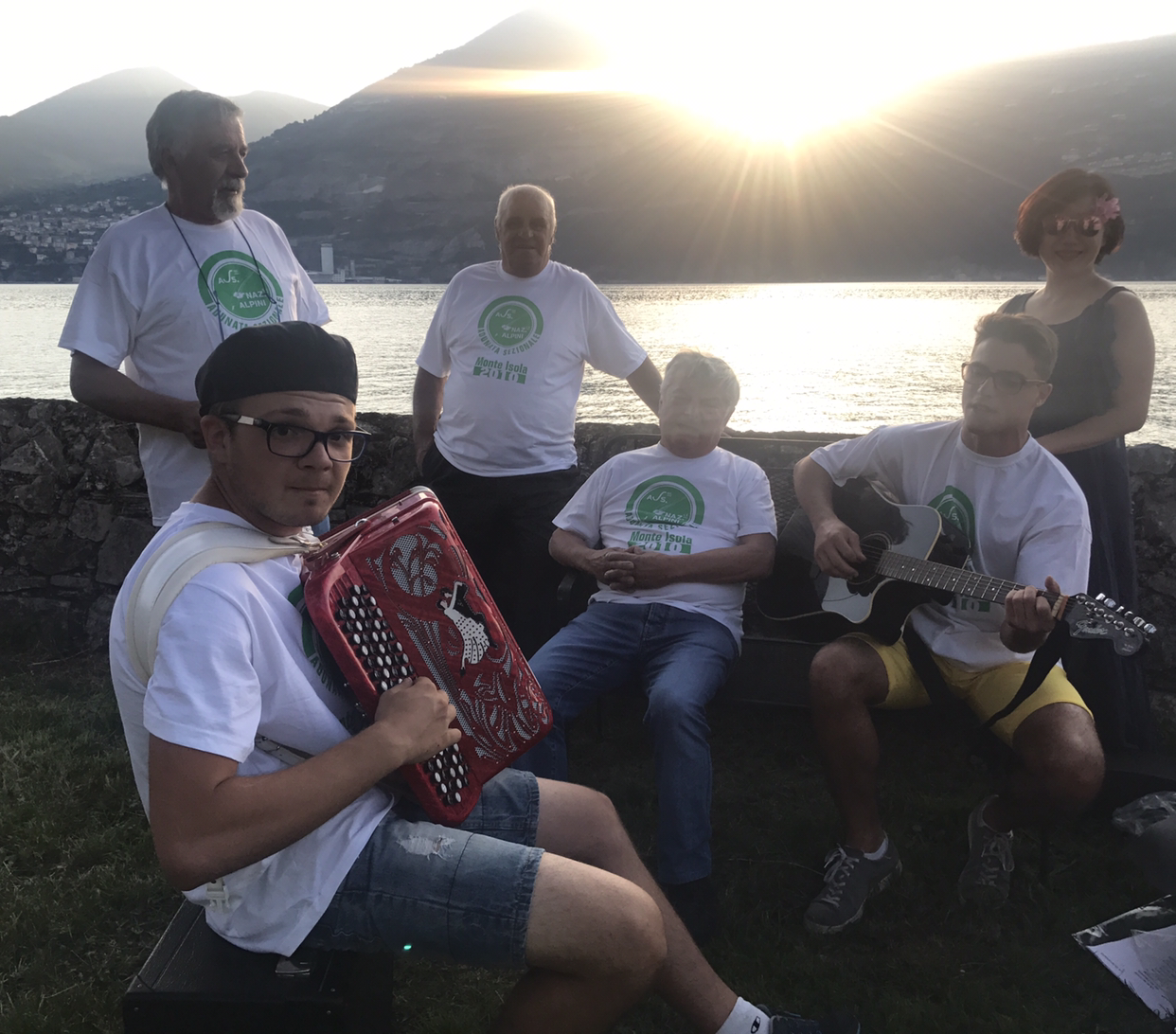 그날 밤 내가 꿈꾸던 이태리 영화의 한 장면이 펼쳐졌다. 나무에는 꼬마전구와 이탈리아 국기가 길게 늘어져있다. 긴 나무 테이블엔 와인잔과 식전빵이 일렬로 줄지어 세팅되어 있다. 나이 지긋한 이태리 할아버지들이 식전주를 드시면서 아코디언과 기타 반주에 맞춰 이태리 민요를 합창한다. 스프릿츠를 들고 호숫가 해지는 풍경을 바라보며 듣는 라이브 음악. 행복하다.