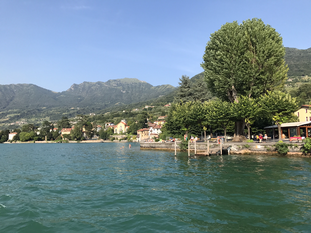 감탄사 연발과 함께 보트에 얼추 짐을 다 싣고 시비아노섬을 향해 ‘출~발!’을 외쳤다. 뒷 갑판에 앉아 호수를 가르며 바람을 온몸으로 느낀다. 눈부신 풍광에 선글라스를 끼고 마을광경을 감탄하며 보다가 사진 찍기 바쁘다. 보트가 지나며 호수에 긴 물 꼬리 흔적을 남긴다.