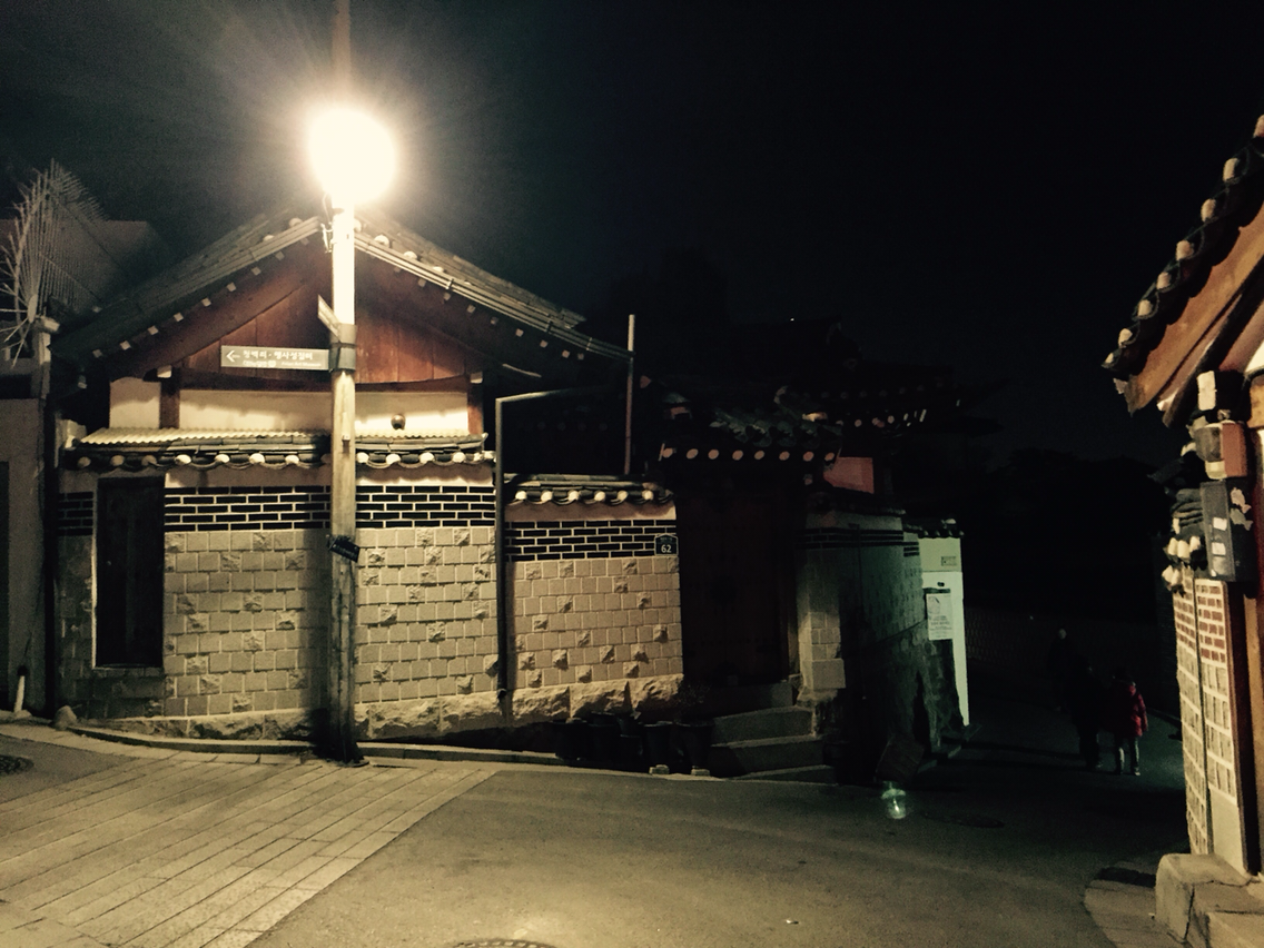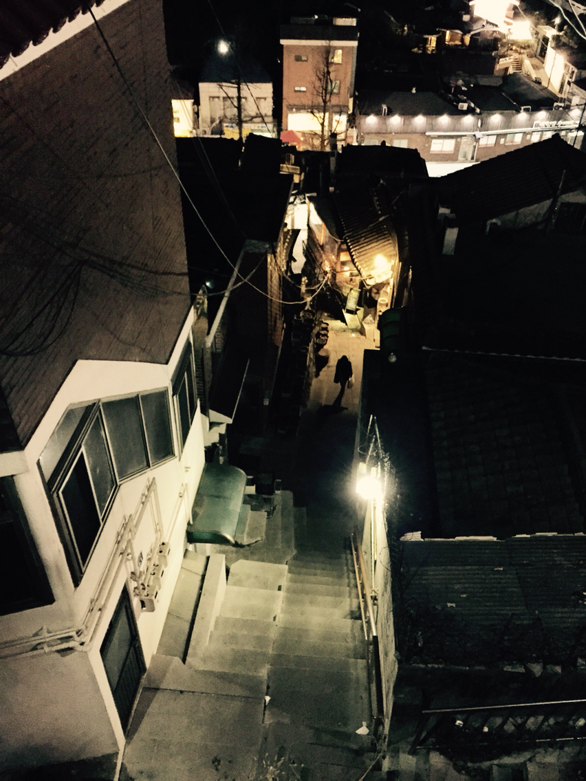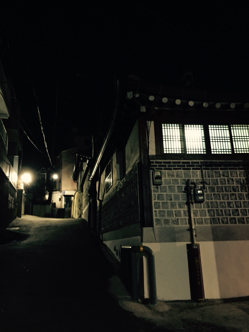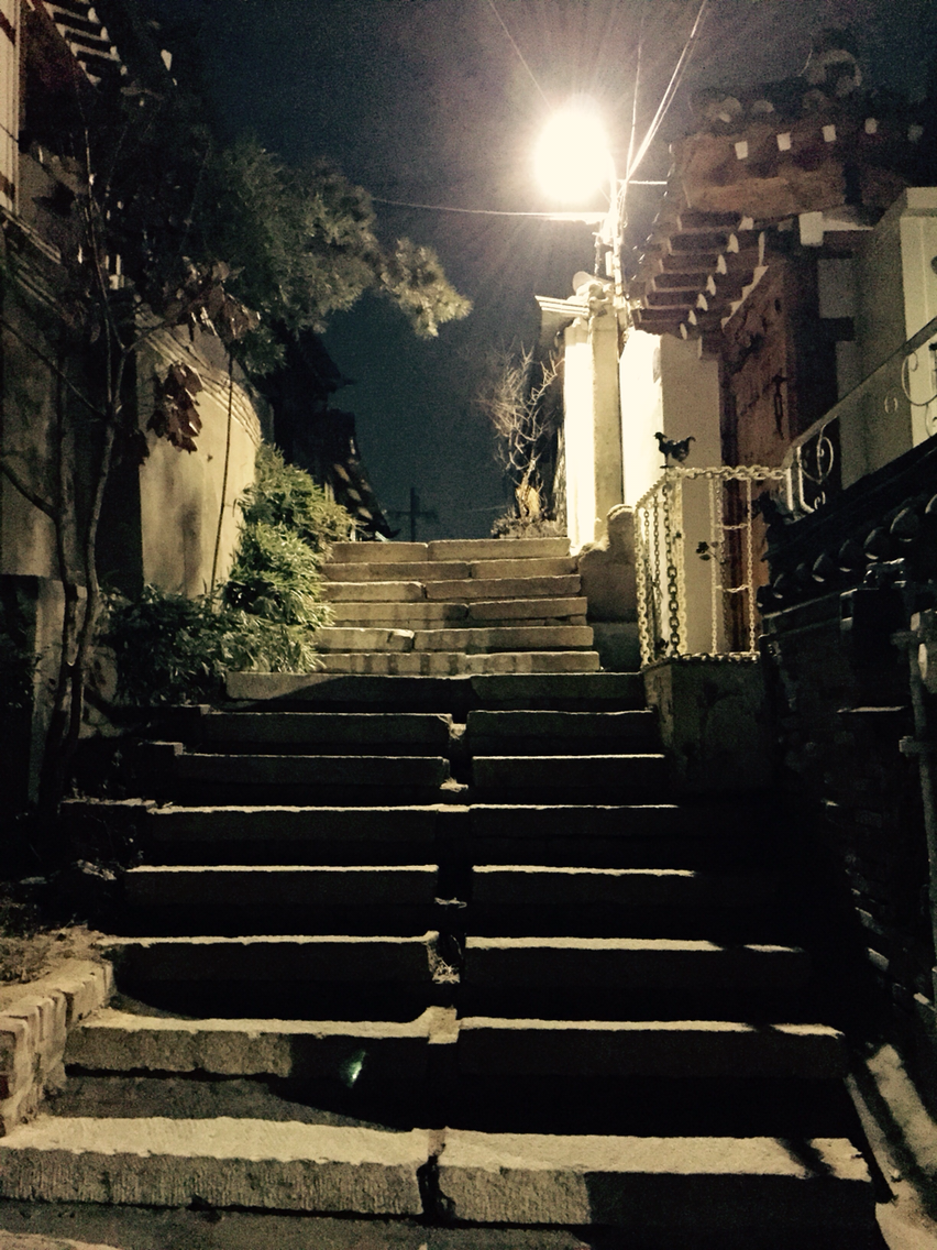 고개를 숙였더니 돌계단 밑으로 남자인지 여자인지 모르겠지만 봉지 하나 흔들면서 터벅터벅 가로등 불에 의지해서 집으로 걸어가는 사람도 보이고, 고개를 들었더니 총총 빛나는 별이 간간이 보이는 밤하늘에 연결된 돌계단 위 한옥들 사이로 가로등 불 하나가 밝게 빛을 발하고 어서 올라오라고 손짓한다. 그 순간 나도 모르게 '내 손에도 봉지 하나 들고 있는 건 아닌가?'하고 손을 쳐다본다.