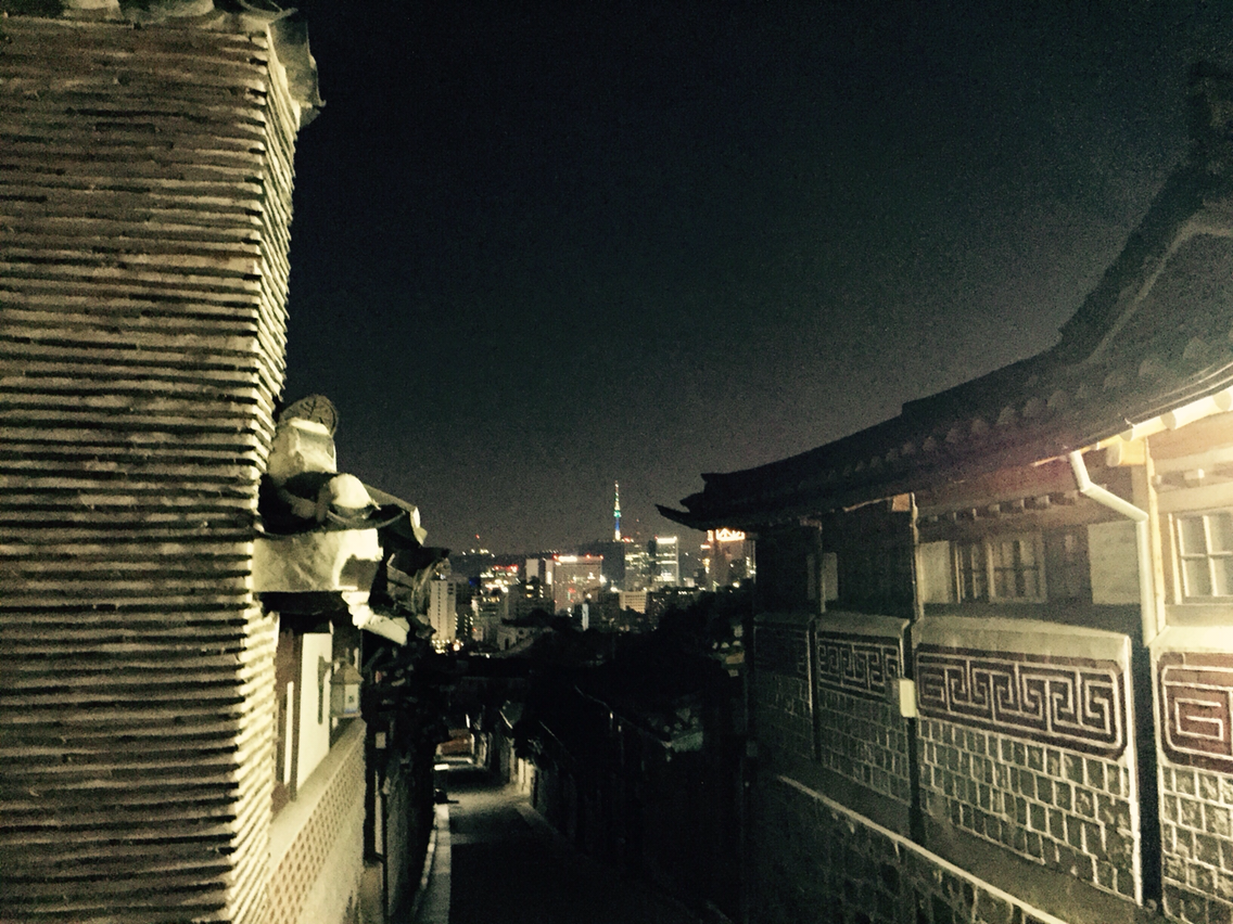 한옥이 아무리 좋아도 가회동 하룻밤을 집안에서만 보낼 수 없다. 식사 후 아버지가 자리를 털고 일어나시자 온 식구가 같이 가회동 투어를 간다. 최근 감기로 기력이 좀 빠진 어머니만 사랑채에 자리를 깔고 좀 누워 쉬고 싶다고 해서, 나는 남기로 했다. 덕분에 식구들이 돌아올 때까지 어머니와 도란도란 얘기하다가 또 한옥 여기저기를 기웃기웃하면서 지하 TV 실 책장에 있는 책도 한 권 가지고 올라와서 읽기 시작했다. 한참 있다 삐거덕하는 소리와 함께 식구들이 하나둘 도착한다. 역시 뛰기 좋아하는 조카 놈들이 일착으로 들어오고 어른들이 뒤를 이어 하나둘 집안으로 들어서면 마치 우리 집처럼 대문 문간에서 문 활짝 열고 어서 오라고, 추우니까 빨리 들어오라고 마중을 한다. 방금 밥을 먹었는데, 돌아오는 식구들 손엔 또 바리바리 간식거리가 잔뜩이다. 하룻밤만 자고 가는 건데 이 음식들을 언제 다 먹으려고 하는 건지... 그렇게 또 도란도란 부엌과 사랑방 마루에 앉아서 시간을 보내다가, 이번엔 아이들만 놓고 집으로 돌아가 자기로 한 오빠를 마중하러 식구들이 다 일어났다. 밤 마실이다. 가회동 길 언덕길을 내려가 인사동까지 걸어가서 오빠를 택시 태워 보내고, 우리는 삼청동으로 해서 돌길을 타고 언덕을 올라 북촌 8경을 하나씩 거쳐 가회동으로 내려간다. 북촌 언덕 꼭대기에 서보니, 저 멀리 팔각정을 끼고 성곽길에 불빛이 굽이굽이 보이고, 아래로는 삼청동 상점들이 어둠 속에서 환하게 불빛을 발한다. 부드럽게 휘어지는 처마를 달고 있는 한옥집들 고즈넉한 골목 사이로 작지만 나름 뾰족하게 침을 세우고 형광빛을 발하는 남산타워도 그저 예뻐 보인다.