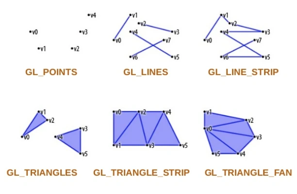 GL_TRIANGLE_FAN : 첫 삼각형 시작 정점을 기준으로 이전 삼각형의 마지막 정점과 추가 정점을 이용하여 삼각형을 그린다. 첫 번째 삼각형을 그릴 때는 (v0, v1, v2), 두 번째는 (v0, v2, v3), 세 번째는 (v0, v3, v4)의 순으로 반복하여 그린다. 마지막은 (v0, v4, v5)이다.