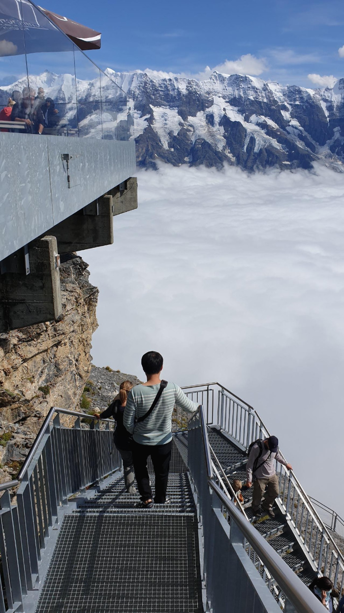 비르그에서는 스릴 워크가 가능하다. 말 그대로 스릴이 넘치는 둘레길이다. 이 길을 걸으면서 보는 풍경이 쉴트호른보다 훨씬 기억에 남는다. 뭔가 좀 더 풍경과 가까워진 기분이었고 산맥이 눈높이에 딱 정면으로 들어왔기 때문이다. 무서운 건 별로 좋아하지 않아서 스릴은 즐기지 않지만 생각보다는 갈만했다.