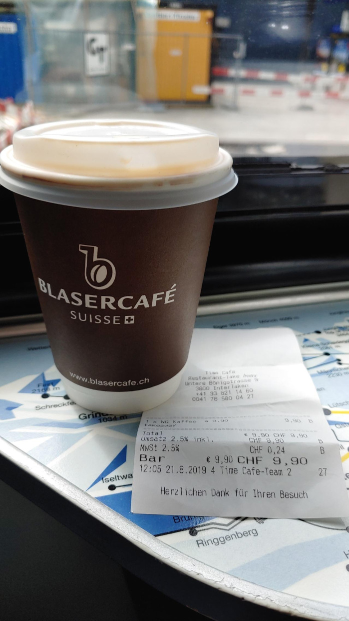 기차를 타기 전에 커피가 마시고 싶어서 근처 카페에 들렀다. 매장 입구에 있는 가격표에서 대충 커피 가격을 보고 들어갔는데 막상 가게 안 메뉴판에는 마시려던 카페모카가 없었다. 일단 주문을 했는데 가격이... 9.9프랑, 한화 12000원이었다. 이 작은 커피 한 잔이 12000원이라니. 심지어 맛도 없었다.