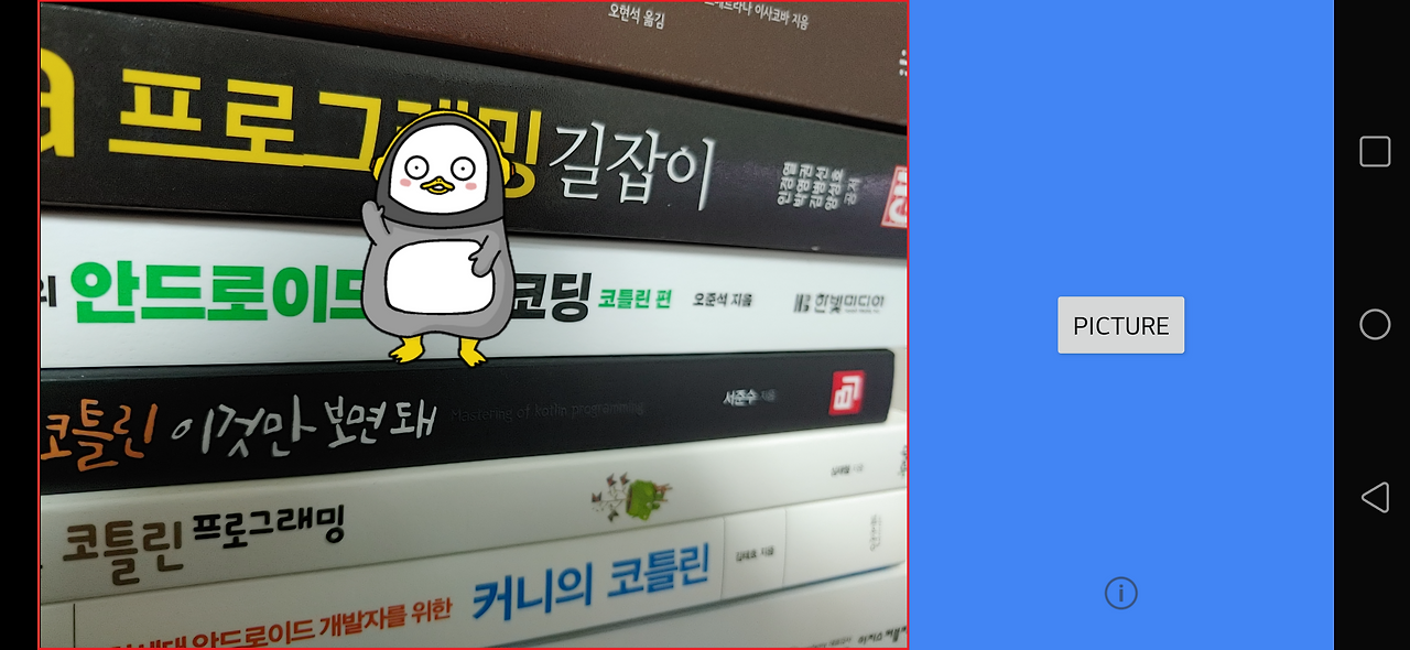 이렇게 하면 카메라 프리뷰 실행 시 펭수 이미지가 오버레이 되어 스티커 효과를 낼 수 있다.