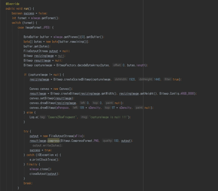 이미지 합성은 Camera2RawFragment.java에서 run()을 검색하여 다음 내용을 추가하면 된다.
