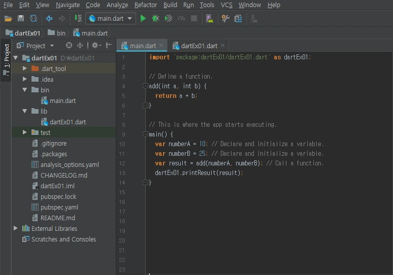 Line 1) import : 패키지 내의 라이브러리를 사용하고자 할 때 라이브러리를 가져오기 위해 사용한다. 해당 라인은 lib 내의 dartEx01.dart를 dartEx01라는 prefix로 가져온다는 의미이다. 파이썬 경험자라면 익숙할 것이다.