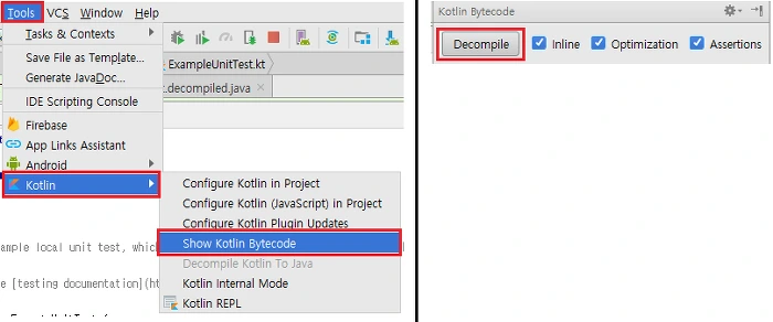 Decomplie 하는 방법은 Tools > Kotlin > Show Kotlin Bytecode 선택 후 Kotlin Bytecode 창에서 Decompile을 누르시면 됩니다.
