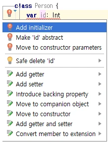일단 initializer를 지워보면 Error:(22, 9) Property must be initialized or be abstract가 발생합니다.