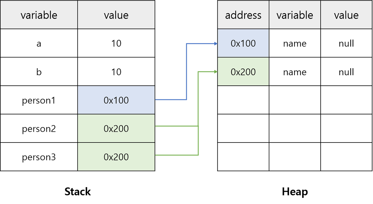 Line 7에서 선언한 Person 객체가 0x100 주소에 생성되었다고 가정하자. 그러면 참조형 변수 person1의 값은 해당 주소값인 0x100이 된다. Line 8의 person2는 0x200을 참조한다고 가정하자. 그림으로 그리면 다음과 같다.