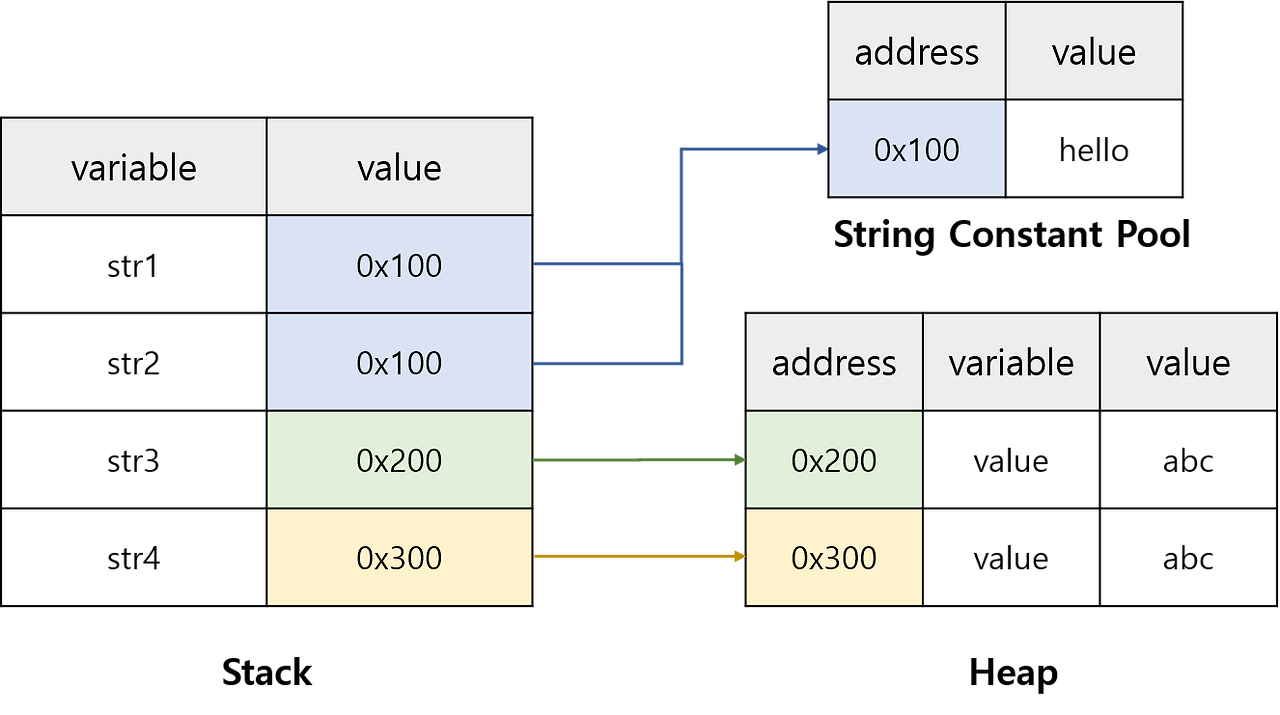 Line 5의 결과가 true가 되는 것은 str1과 str2의 주소값이 동일하기 때문이다. str1과 str2는 동일한 문자열 상수를 참조하고 있어서 주소값이 동일한 것이다.