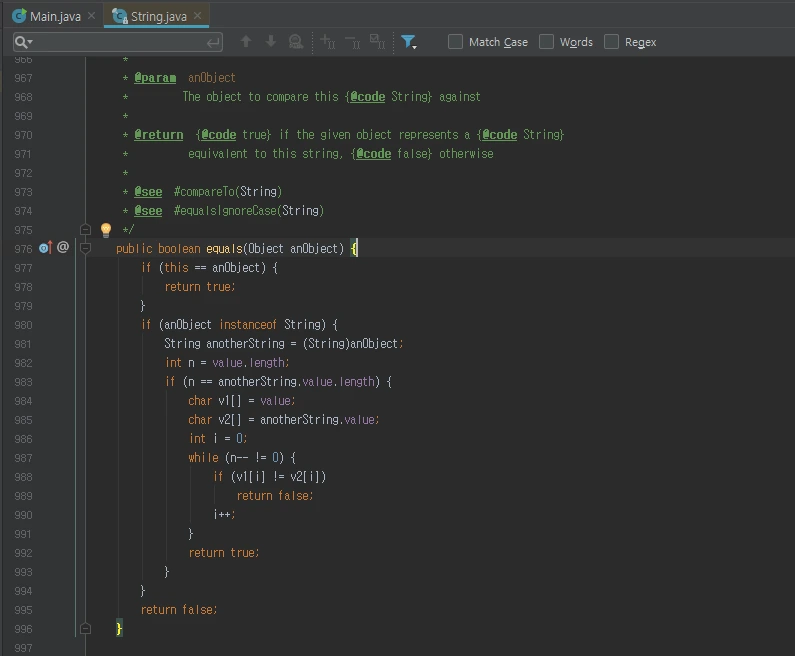 문자열을 char 단위로 한 글자씩 모두 비교하여 동일하면 true를 리턴한다. 따라서 서로 다른 객체라도 같은 문자열을 가지고 있으면 동일하다고 판단하는 것이다.