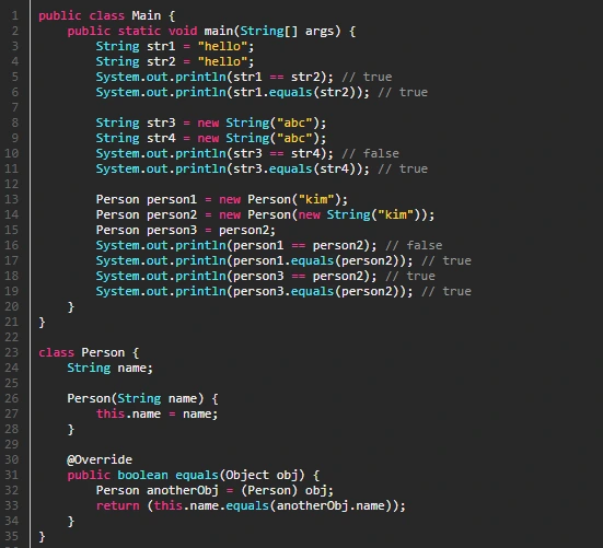 Line 17은 Person 클래스에서 재정의된 equals()를 사용한다. 따라서 두 객체의 name의 문자열이 kim으로 동일하기 때문에 true이다. person2는 name에 값을 할당할 때 new String("kim")으로 했기 때문에 새로운 String 객체를 생성한 것이다. 따라서 만약 equals()를 재정의할 때 return (this.name == anotherObj.name); 과 같이 했다면 fasle가 될 것이다. 왜냐면 name이 가리키는 주소값은 다르기 때문이다.