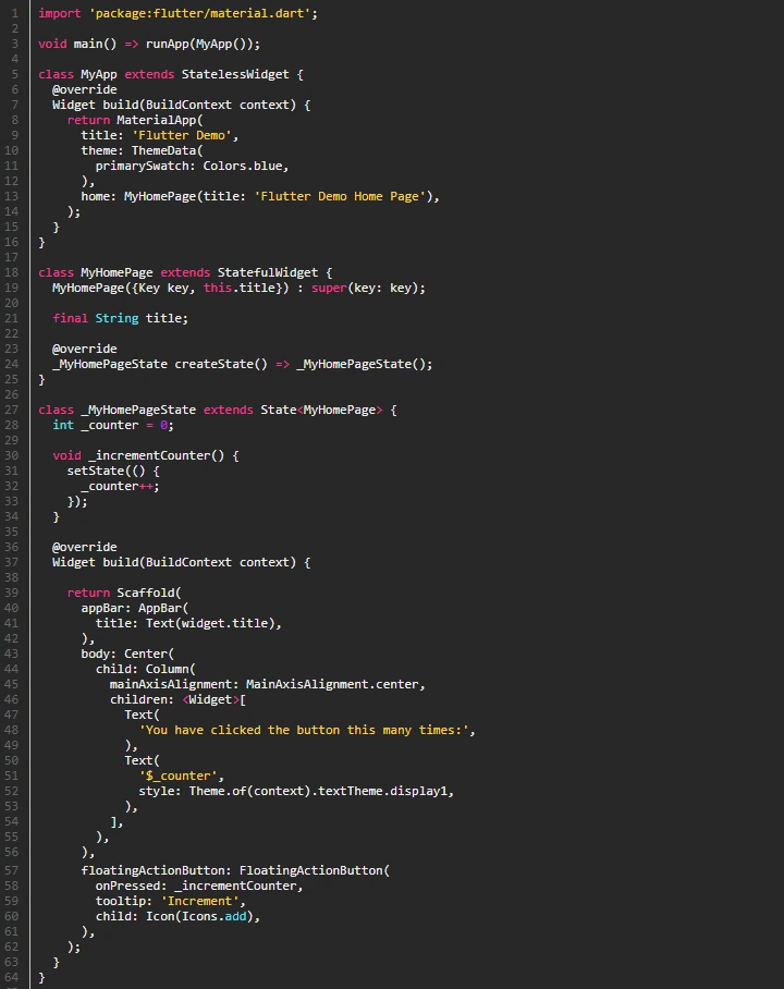 Line 27~64 : 세부 내용의 의미는 일단 넘어간다. 간단히 말하면 State의 내용은 StatefulWidget의 동작과 레이아웃 등을 담고 있다. 실질적인 UI를 그리기 위한 위젯 트리(Widget Tree)를 구성하고 있는 것이다.