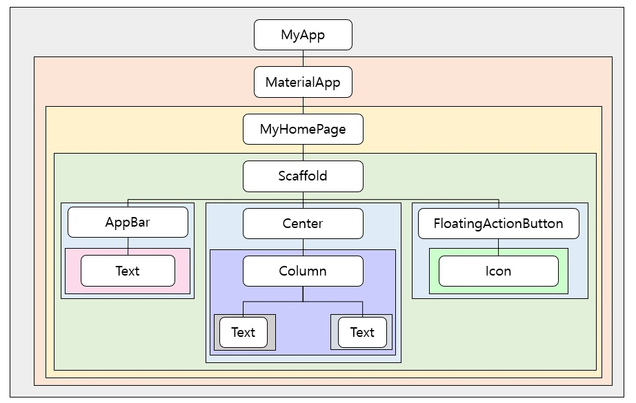 각 네모 박스가 모두 위젯이다. StatelessWidget인 MyApp도 위젯이고 StatefulWidget인 MyHomePage도 위젯이다. MyHomePage에서 생성된 State 객체인 _MyHomePageState에서 UI를 구성하는 모든 요소가 위젯이다.